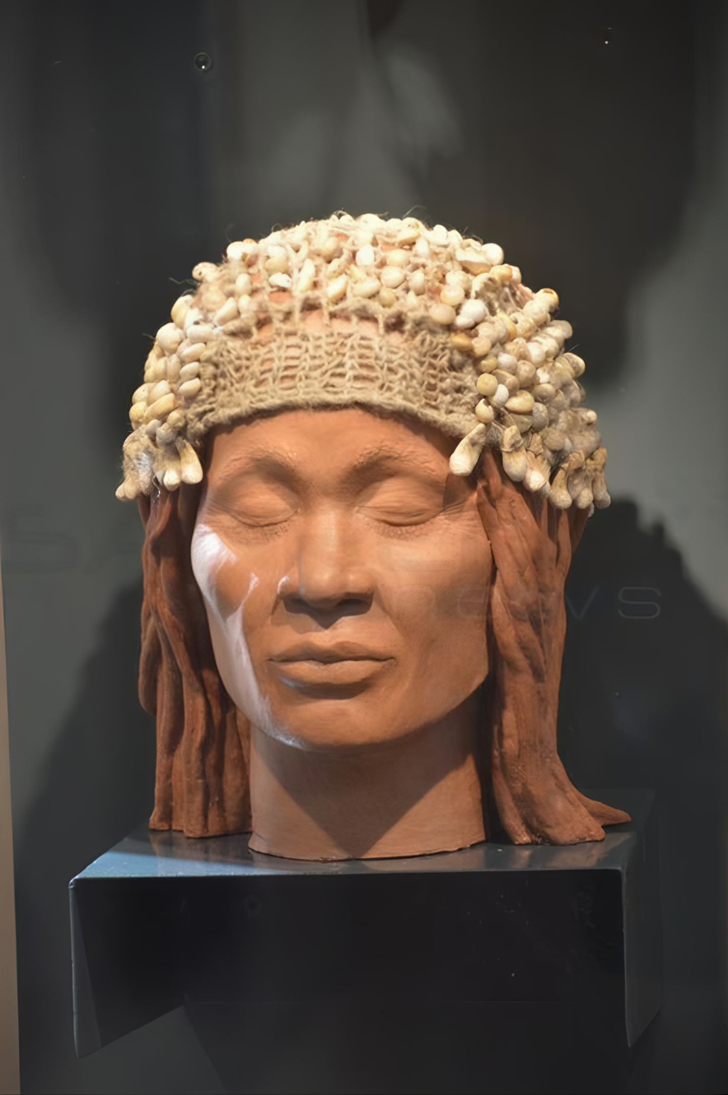 두개골은 작은 해양 조개 껍데기랑 붉은 사슴 이빨 red deer teeth로 완전히 덮인 상태였다.