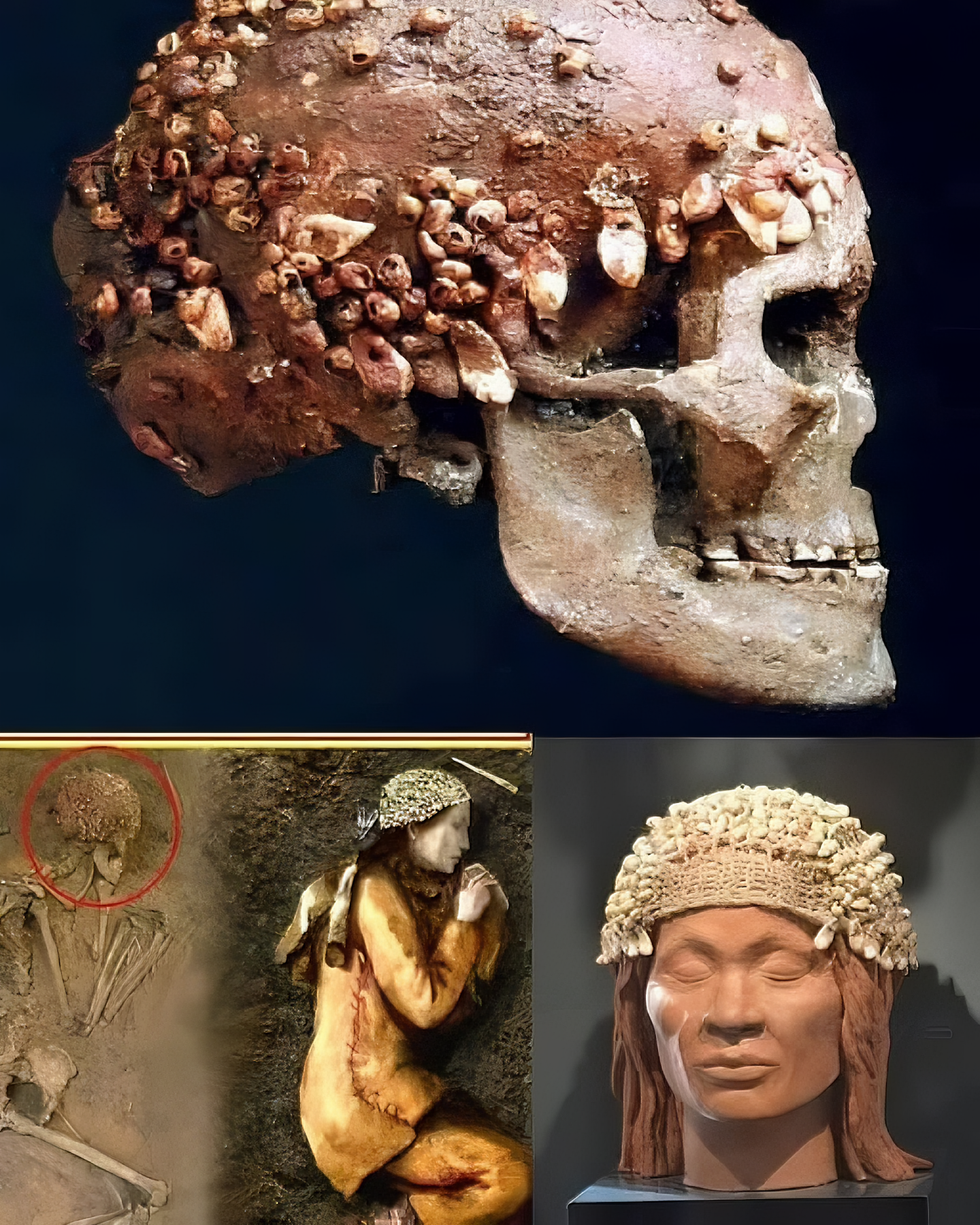 그가 입은 왕관은 300개 해양 조개껍데기와 붉은 사슴 이빨로 만든 놀라운 머리띠였다.