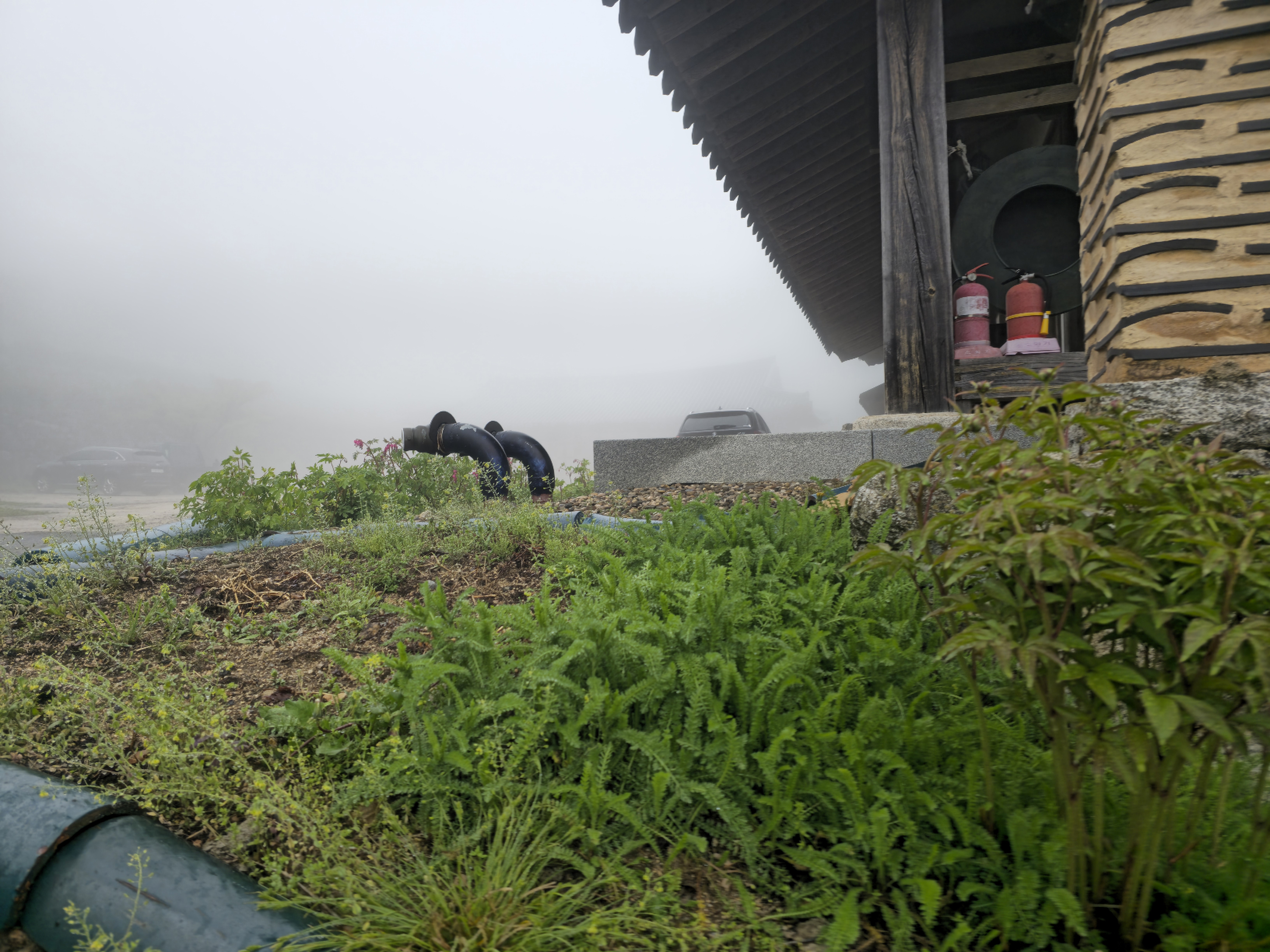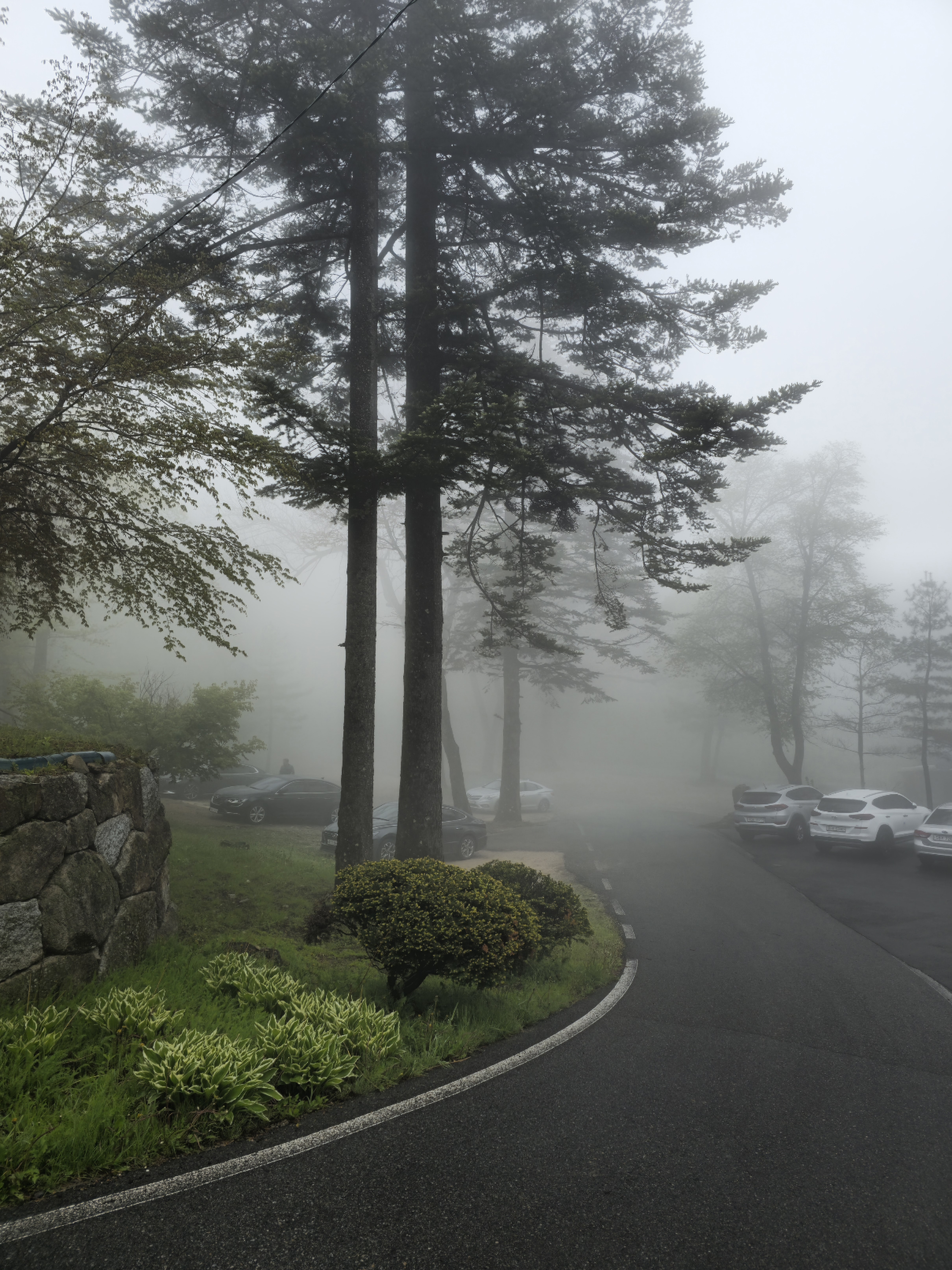 오늘 계속 비가 오다 그친 뒤라 아래쪽은 햇볕이 나지만 해발 1317미터 수도산은 대략 눈대중으로 700~800고지부터 앞이 안 보일 정도로 짙은 연무가 꼈다.