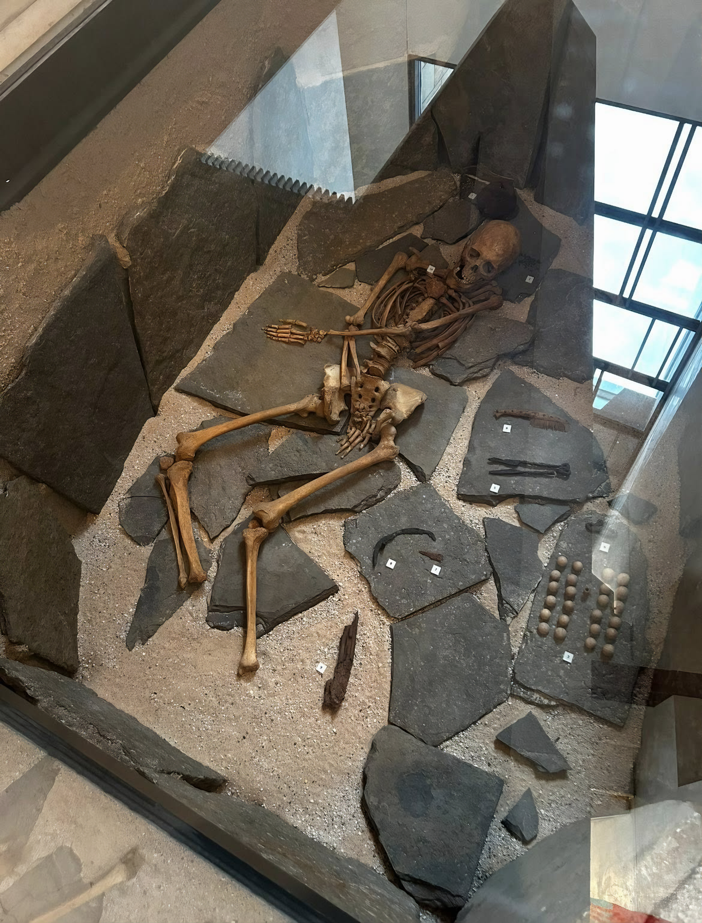 This is a pagan Viking grave, from a Viking and native cemetery in Orkney. A man aged about 30 was buried in a large oval stone-lined pit. The body was covered in planks taken from a boat, with their iron rivets still fixed to them. The grave was filled with sand and at some point, the remains of an older woman were buried in the same grave.