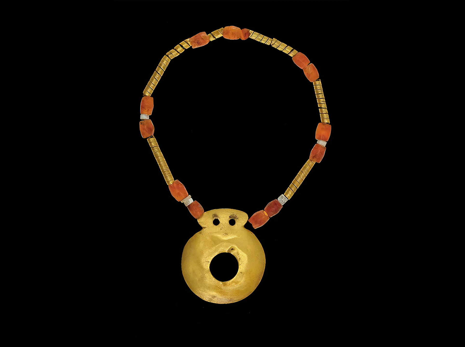 팔꿈치를 구부린 오른손에는 홀scepter을 쥐고 있었다. 그의 목에는 무게 499g에 달하는 890점 금 구슬이 세 가닥으로 묶여 있었다.
