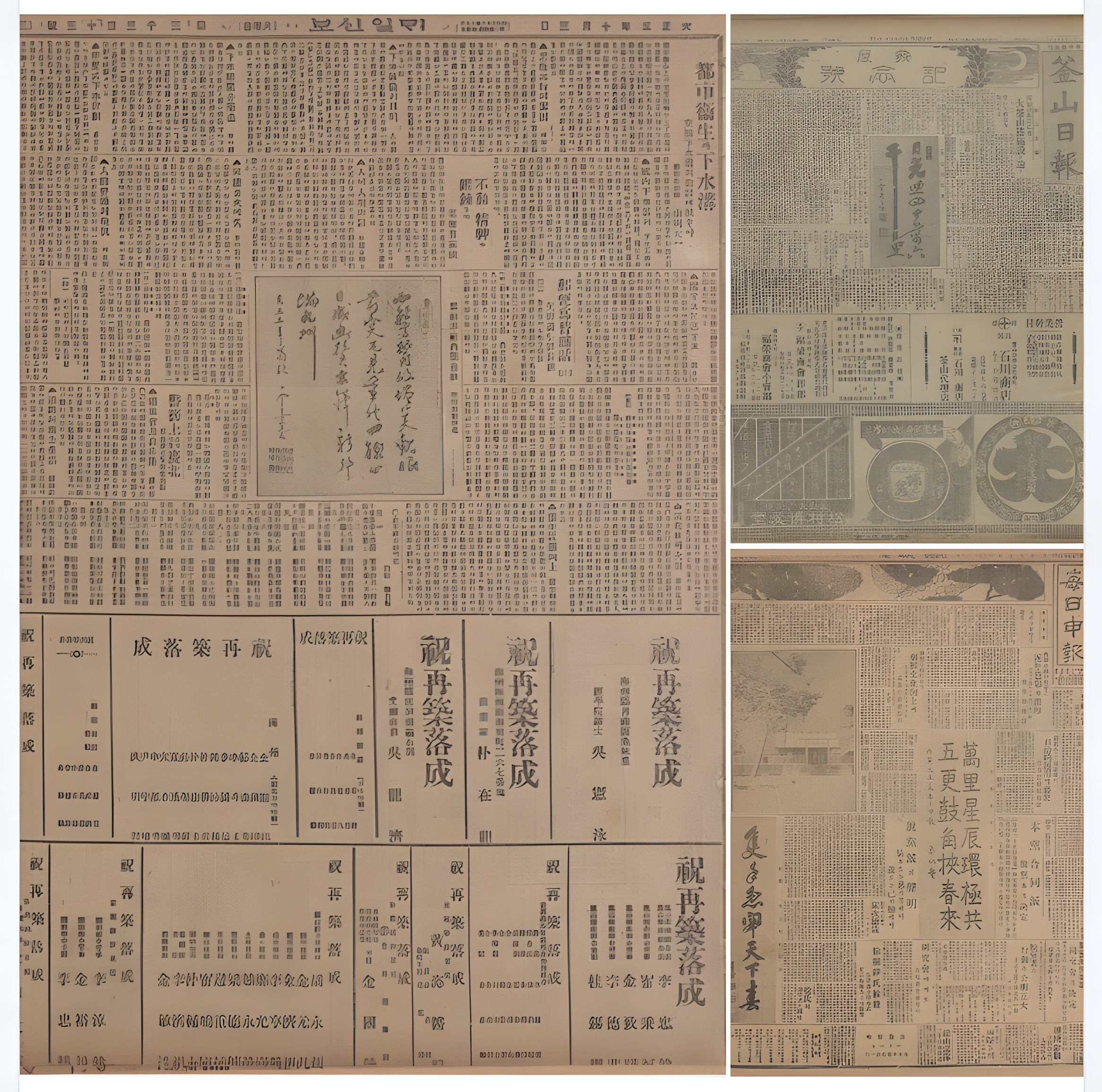차례대로 <매일신보> 1916년 10월 3일자 , <매일신보> 1926년 1월 1일자(왼쪽 아래. 가운데 턱 하니 실린 것은 총독 사이토 마코토(1858~1936)의 휘호) , <부산일보> 1918년 9월 30일자에 실린 이완용 글씨다.