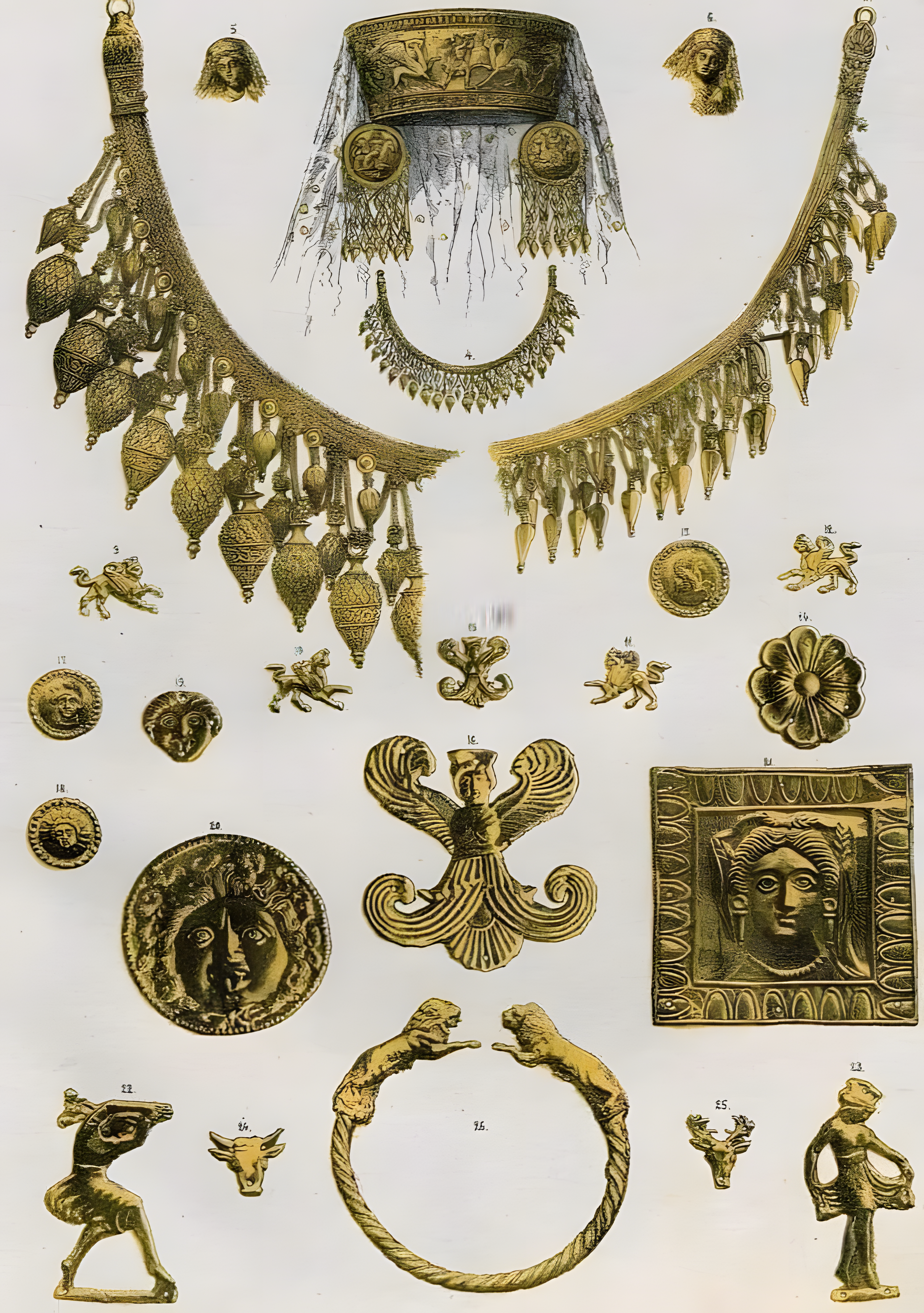 Jewelry of a Scythian queen, found in the Chertomlyk barrow, near Nikopol, Katerynoslavsk Governorate (at present Dnipropetrovsk Oblast, Ukraine).