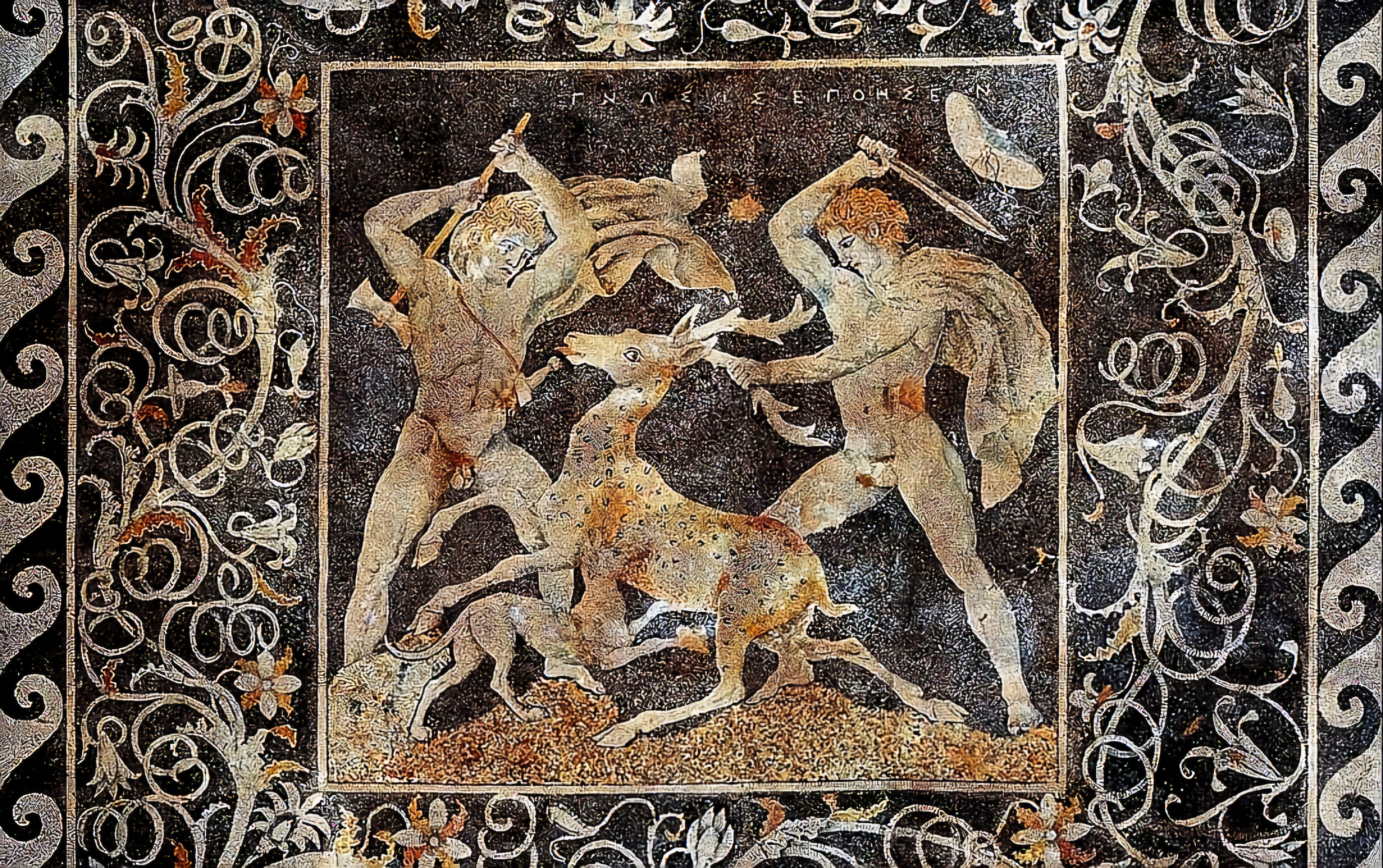 이 수사슴 사냥 모자이크 Stag Hunt mosaic 는 기원전 4세기 어느 저명한 집안 저택에서 확인한 것으로, 그 집은 소위 "헬레나의 강간 집 House of the Abduction of Helen 혹은 House of the Rape of Helen"라 일컫는 곳이다.