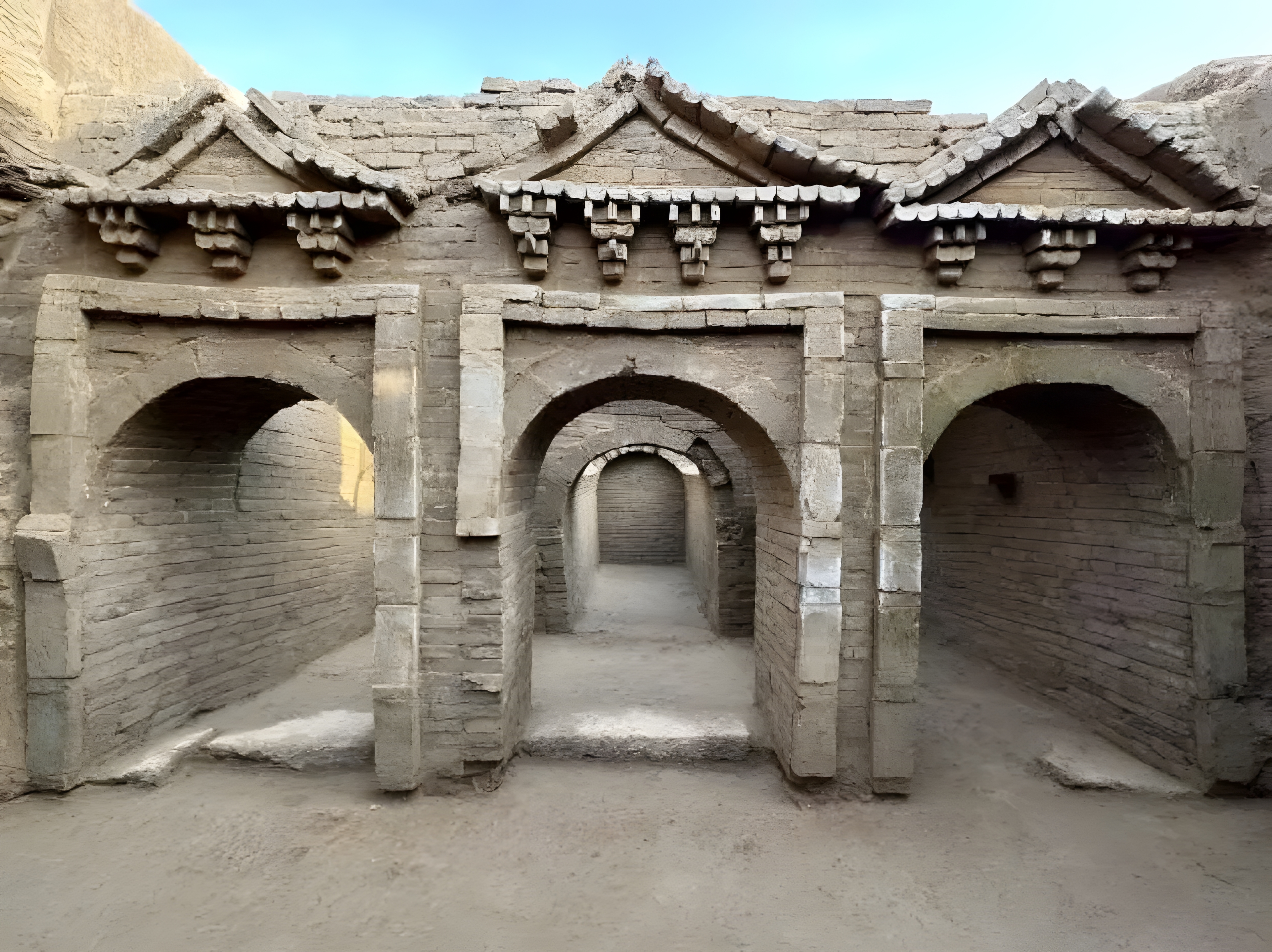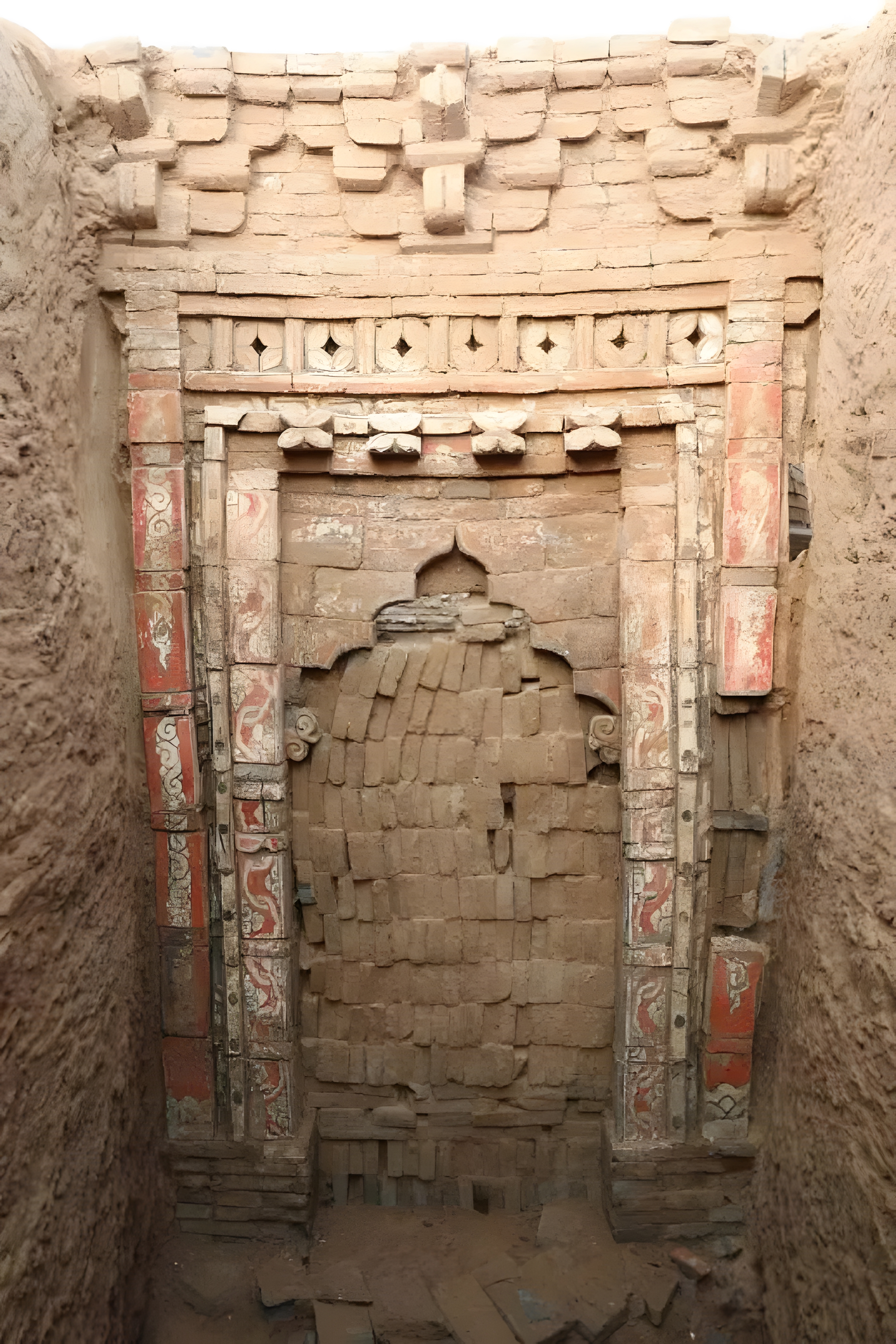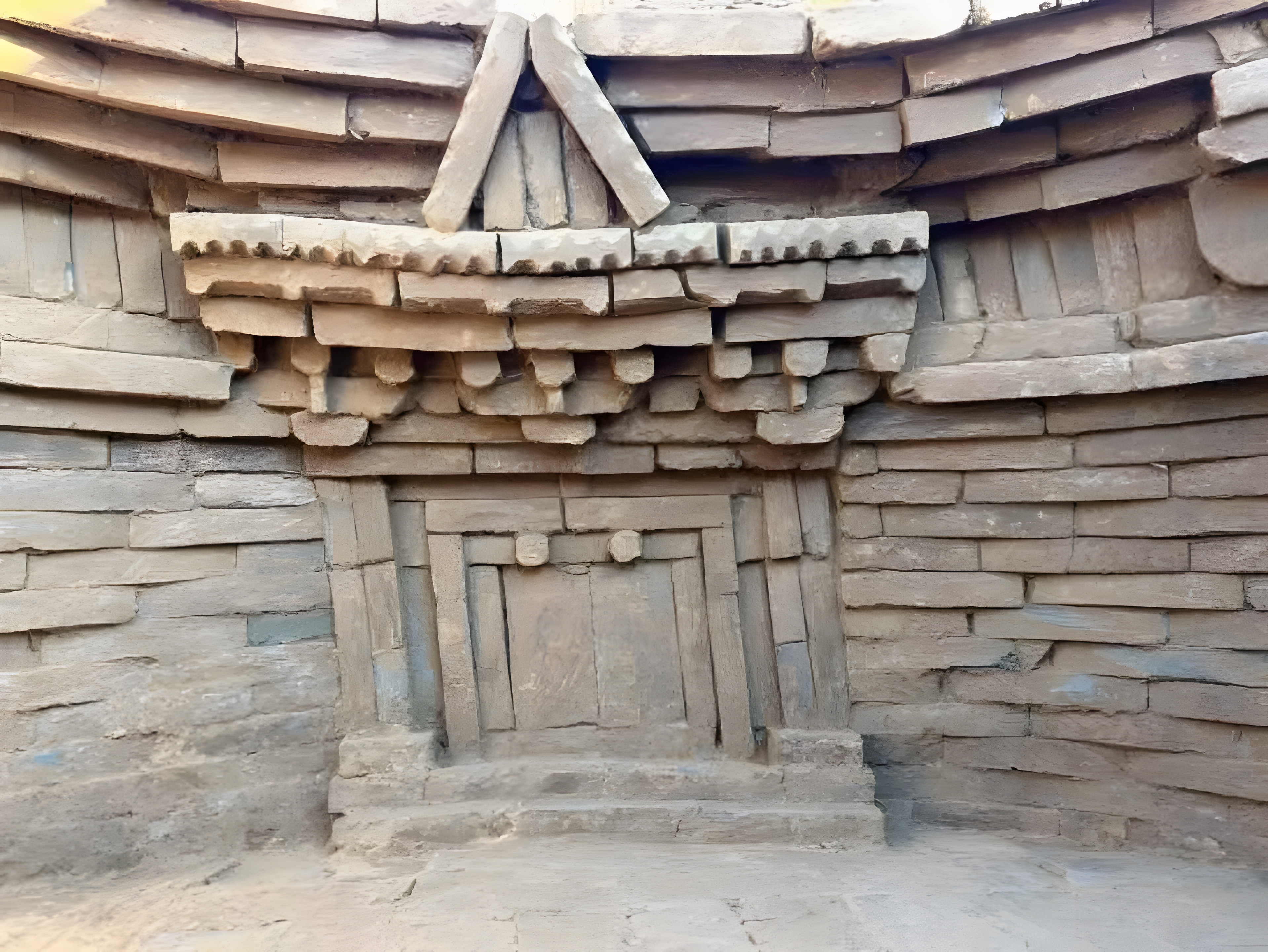 벽돌 조각은 주로 모조 목조건축 문루 门楼, 게산식 건축歇山式建筑 , 램프 檠 등을 포함하며 구조는 대부분 비교적 간단하다. 2인 합장과 3인 합장이 대부분이며 부장품에는 도자기 항아리瓷缸 , 도자기 항아리瓷罐 , 도자기 사발瓷碗, 구리 거울, 동전 및 진묘와镇墓瓦가 포함된다.