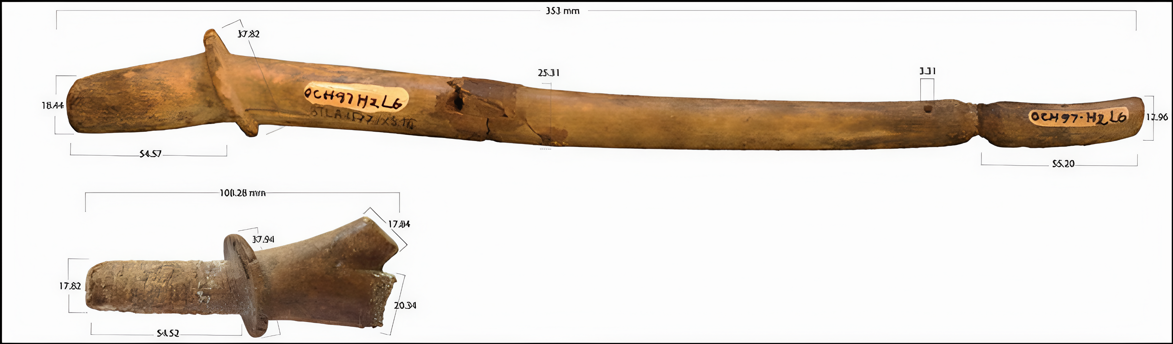 그들이 발견한 이 뿔 한쪽 끝에는 조율 페그tuning peg를 놓았을 수 있는 구멍과 줄을 지탱했을 수 있는 홈이 있는 다리notched bridge가 있다.