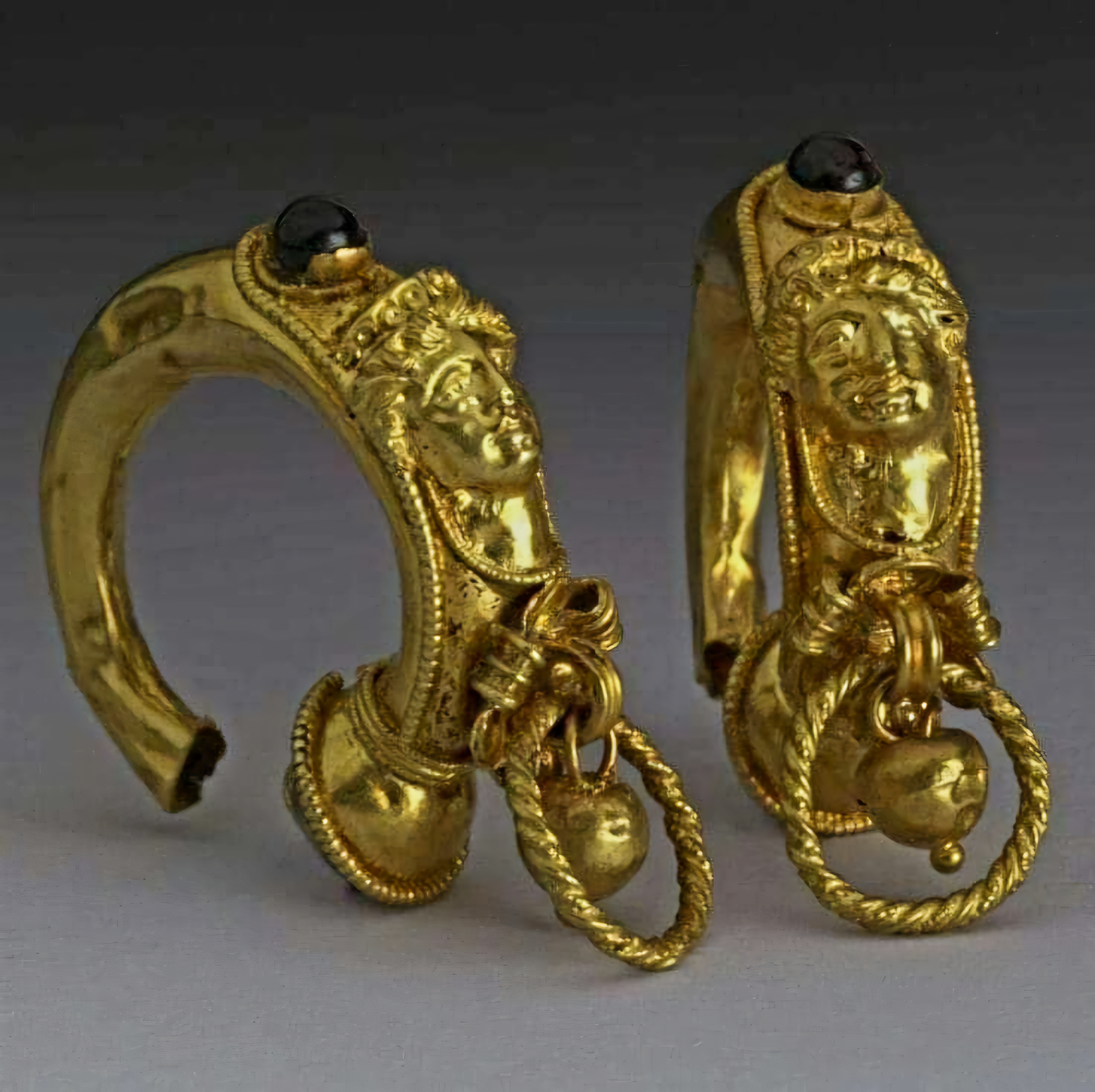 기원전 4-3세기 무렵 에트루리아 문명의 금과 석류석 귀걸이 garnet earrings 한 쌍이다.
