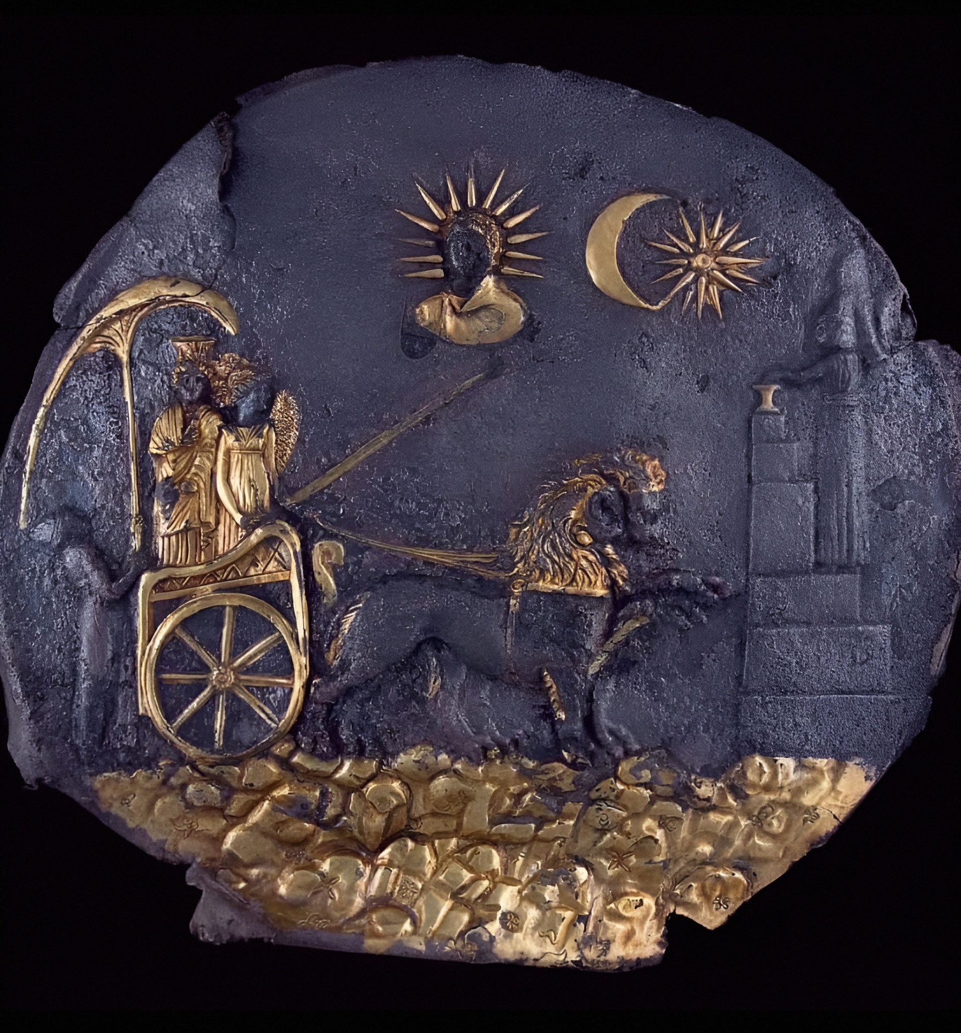 날개 달린 니케 Nike [나이키] 가 몰이꾼을 하면서 두 마리 사자가 끄는 전차를 타고 봉헌 제물을 향해 가는 키벨레 Cybele (위대한 어머니 the Great Mother)를 묘사한 기원전 3~2세기 아이카눔 Aï-Khanum 출토 금도금 은반이다.