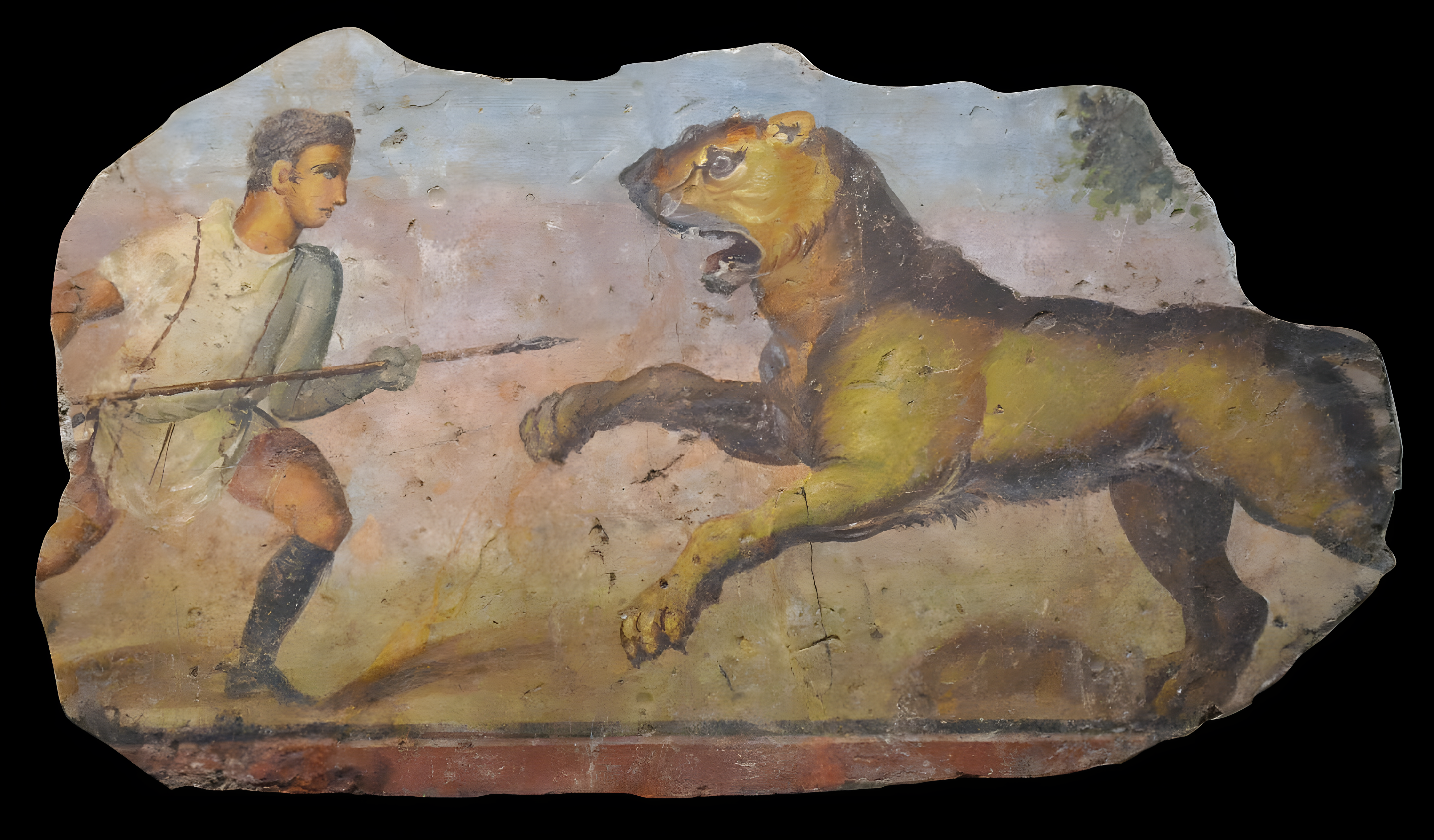 사냥꾼이 암사자를 공격하는 장면을 표현한 로마시대 venatio scene 모자이크. venatio란 hunting을 말한다.