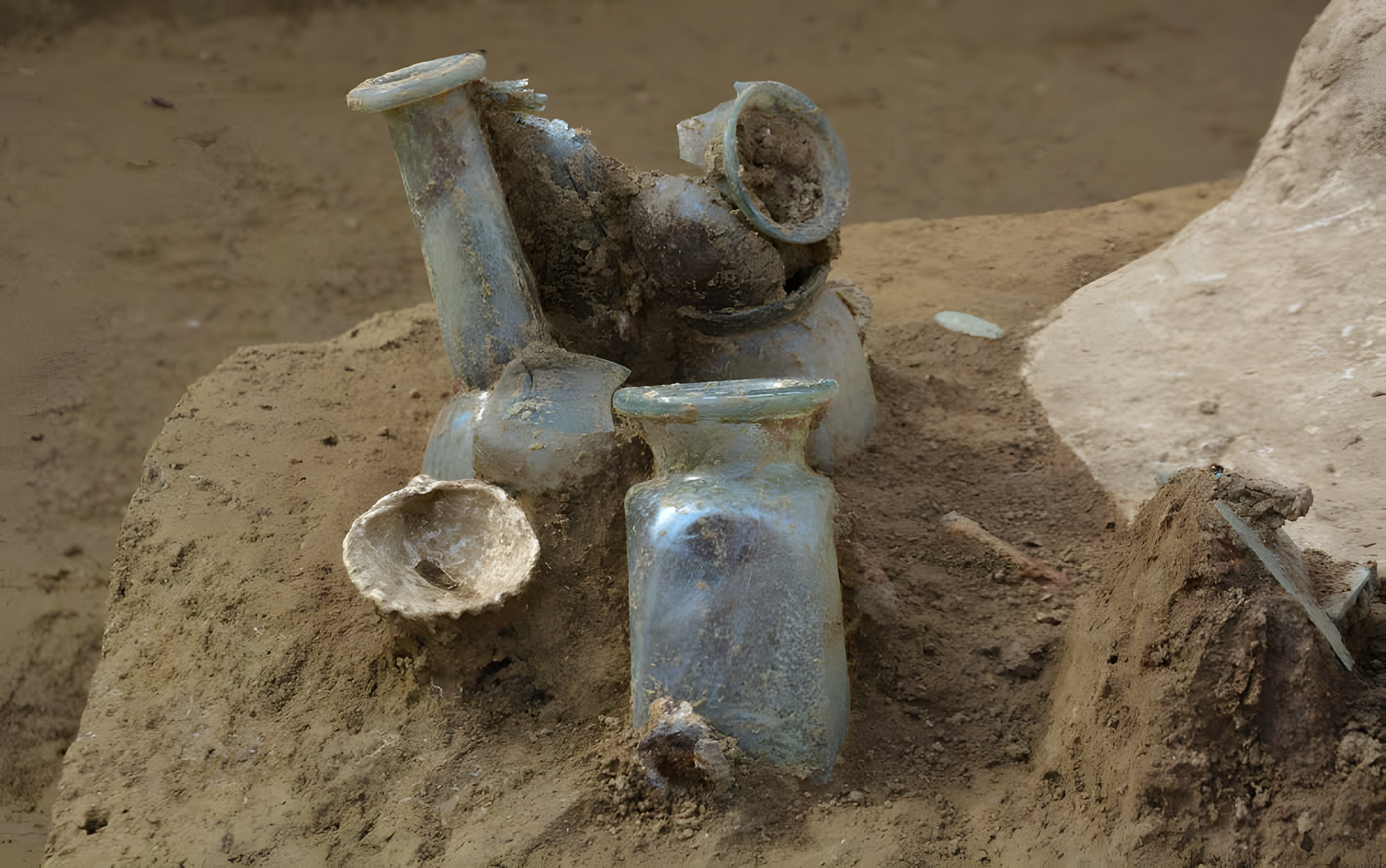 사망자 유해는 납관에 담은 모양이라, 이 납관 옆에 놓인 나무 상자 잔해에서 저런 유리제품을 포함한 유물이 발견되었다.