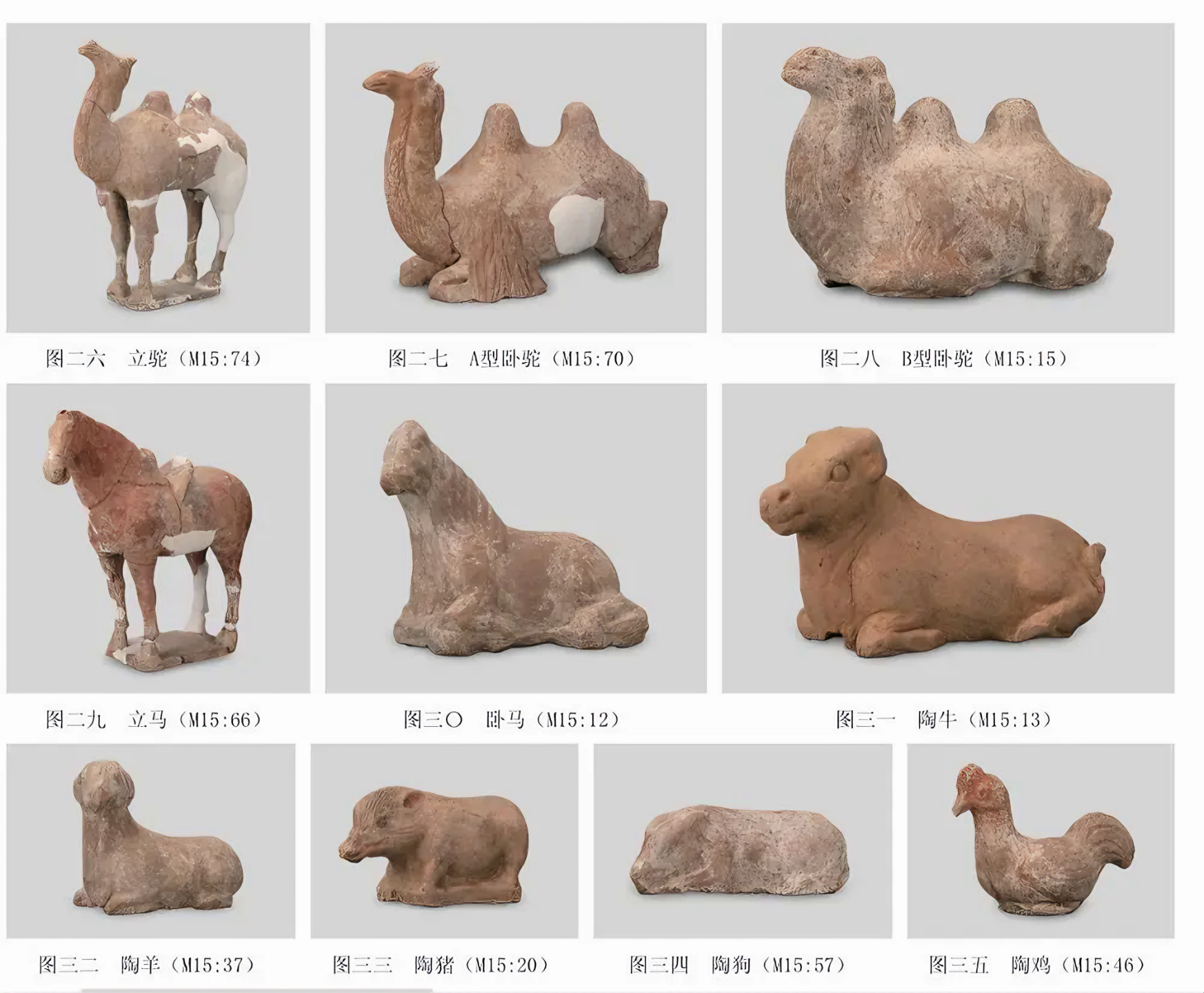 도동물은 총 58점으로 낙타, 말, 소, 양, 돼지, 개, 닭이 있으며 모두 진흙질 홍도, 모형이다.