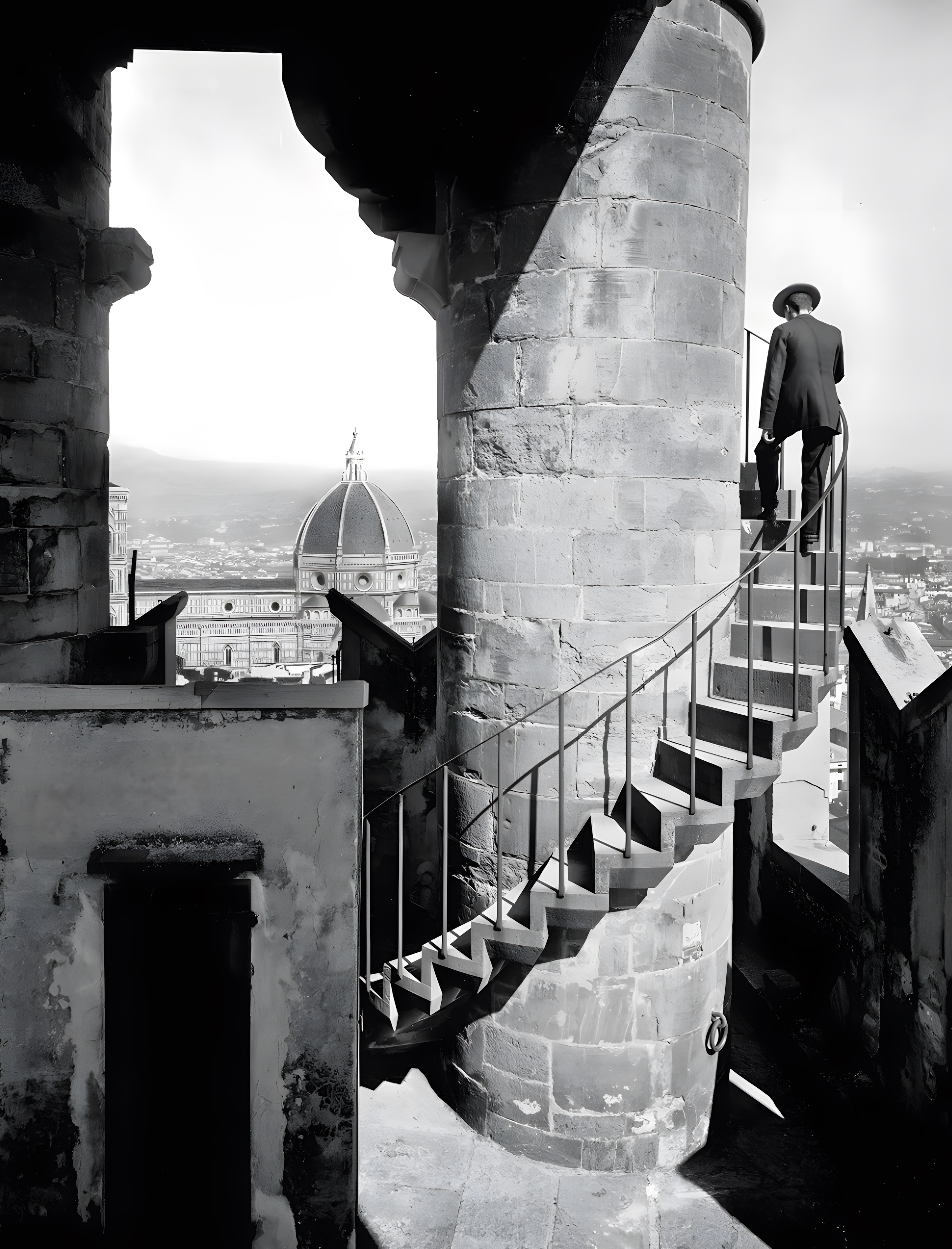 A man climbs up a staircase of the Tower of Palazzo Vecchio, in the background looms Brunelleschi’s Dome from Santa Maria del Fiore, Florence, around 1900. by Fratelli Alinari, 1889