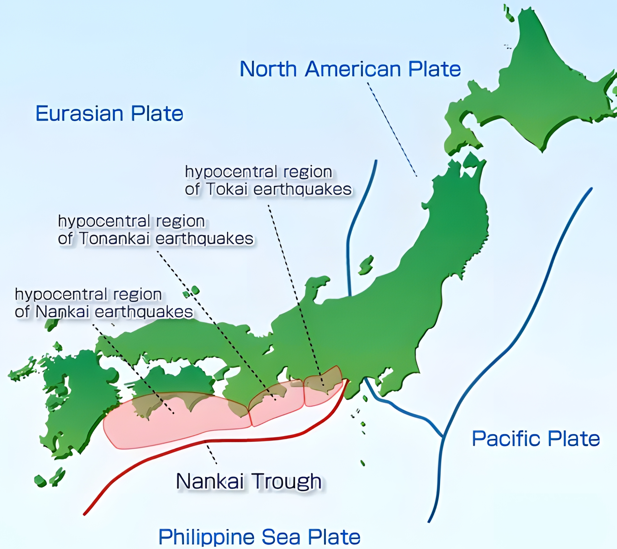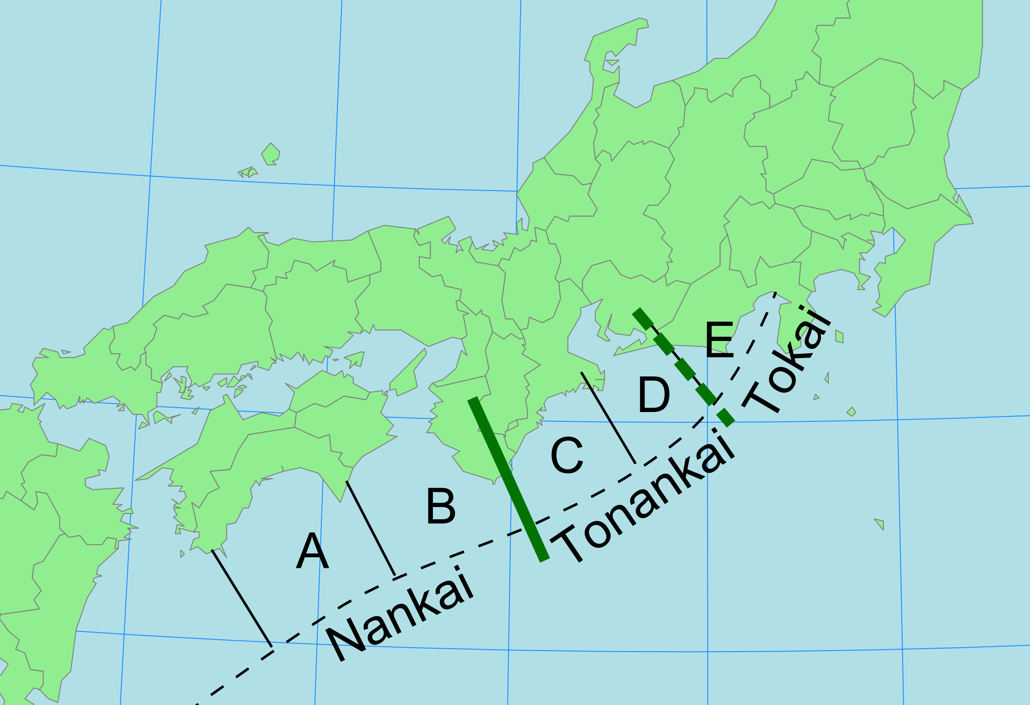 저 중에 계속 문제가 되는 지점이 난카이 트러프 Nankai Trough 라 표시하는 지점이라, 저걸 지금 우리는 흔히 난카이 해곡南海海谷이라 한다. 아마도 교토나 동경을 기준으로 남쪽 바다에 발달한 협곡이라 해서 저리 부를 텐데 Nankai Trough 말고도 남해를 그대로 의역해서 Southern Sea Trough라 부르기도 한다. 외래어 한자 좋아하는 일본에서는 南海トラフ[난까이토라후]라 부르는 모양이다.