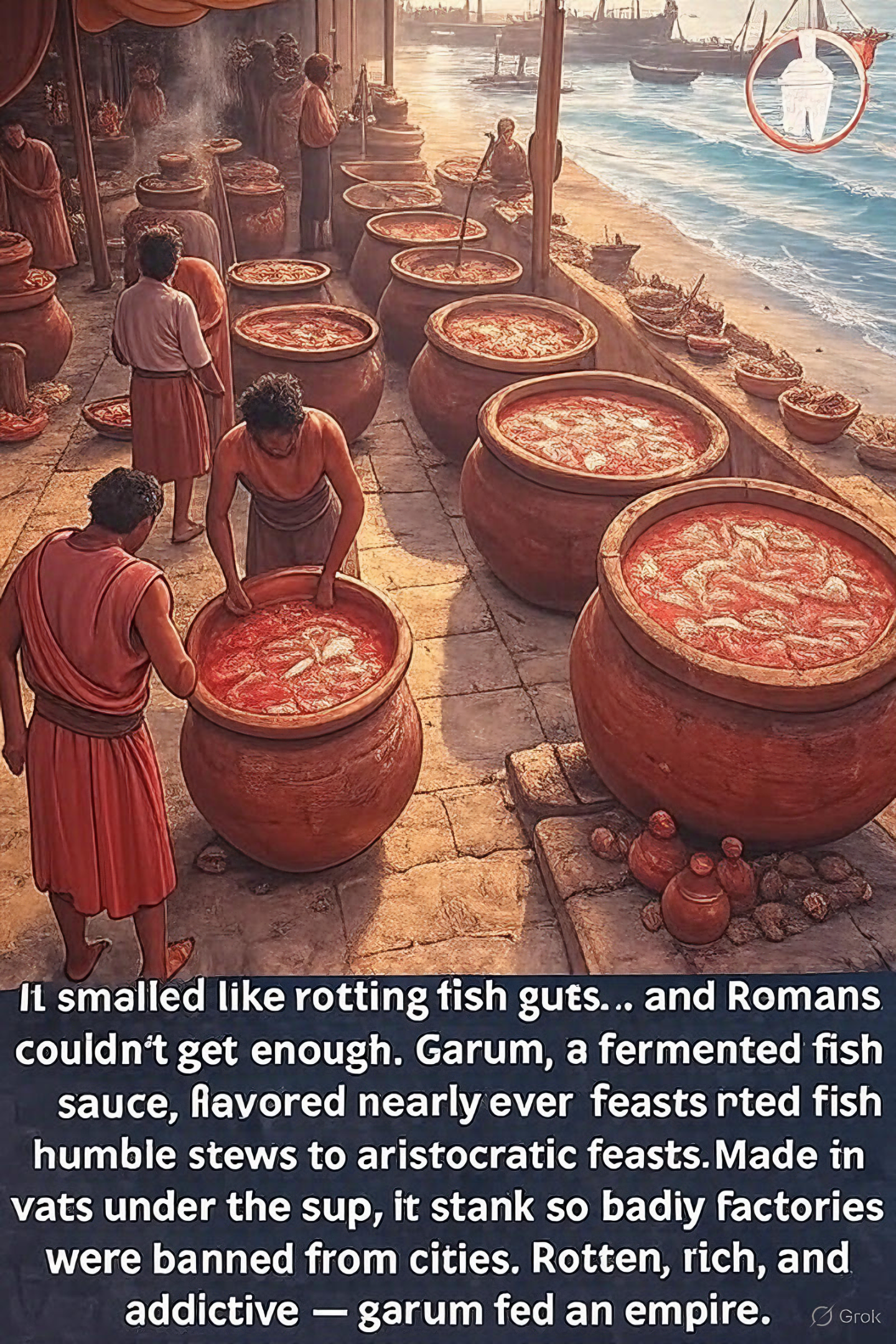 Garum was the Roman world’s most prized condiment — a fermented fish sauce made from anchovies, guts, and salt, left to putrefy in the sun for weeks.