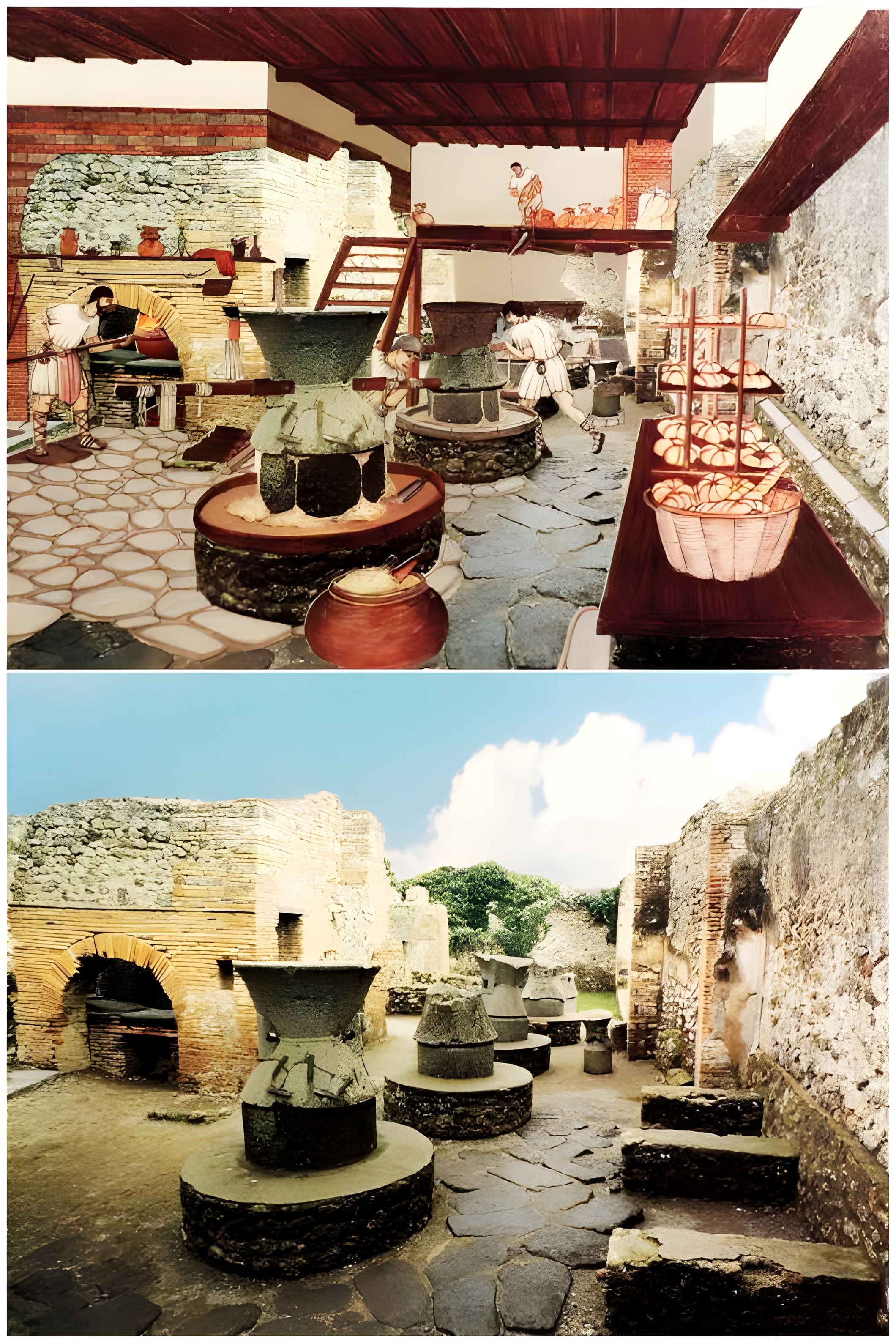 아래 쪽은 폼페이 유적에서 실제로 드러난 빵집 베이커리고