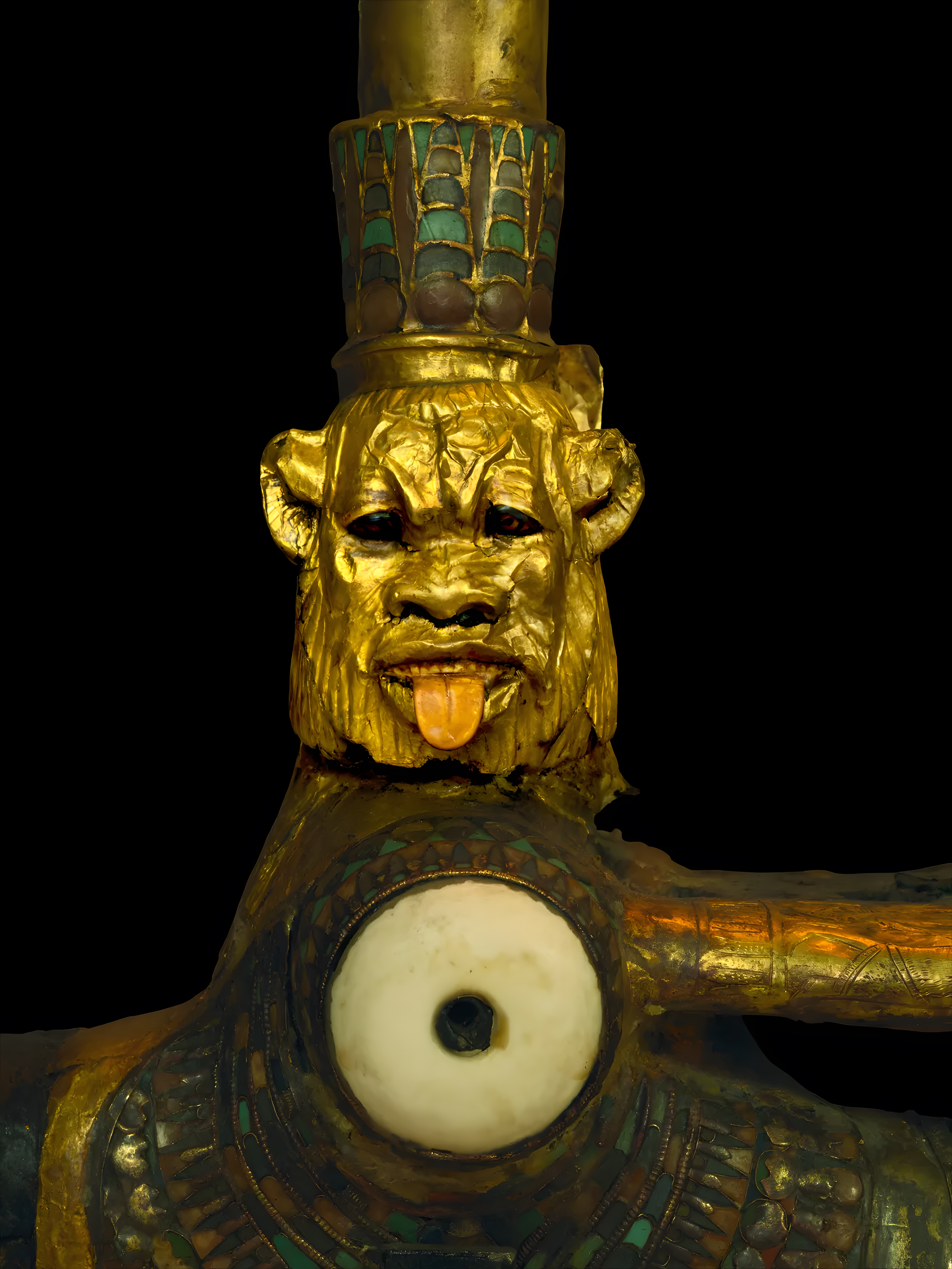 전차 뒷면에는 난쟁이 신 베스Bes의 상아 혀ivory tongues가 입 밖으로 튀어나와 있는 화려한 이미지가 표시되어 있다.