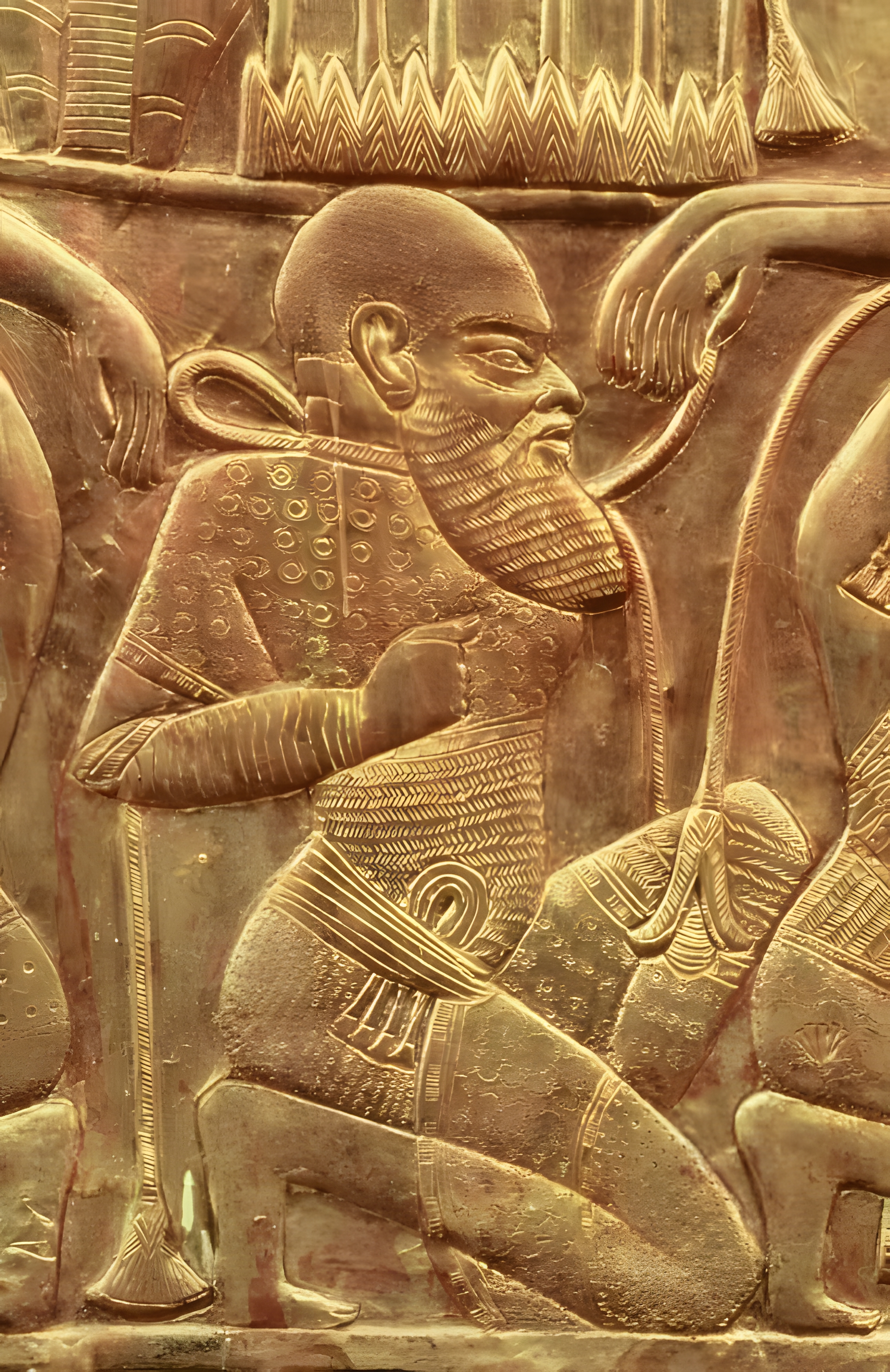 이집트 나일강변 서부 테베 West Thebes 왕들의 계곡Valley of the Kings 투탕카멘 무덤(KV62)에서 출토한 금박 의식용 전차에 보이는 한 장면이다.