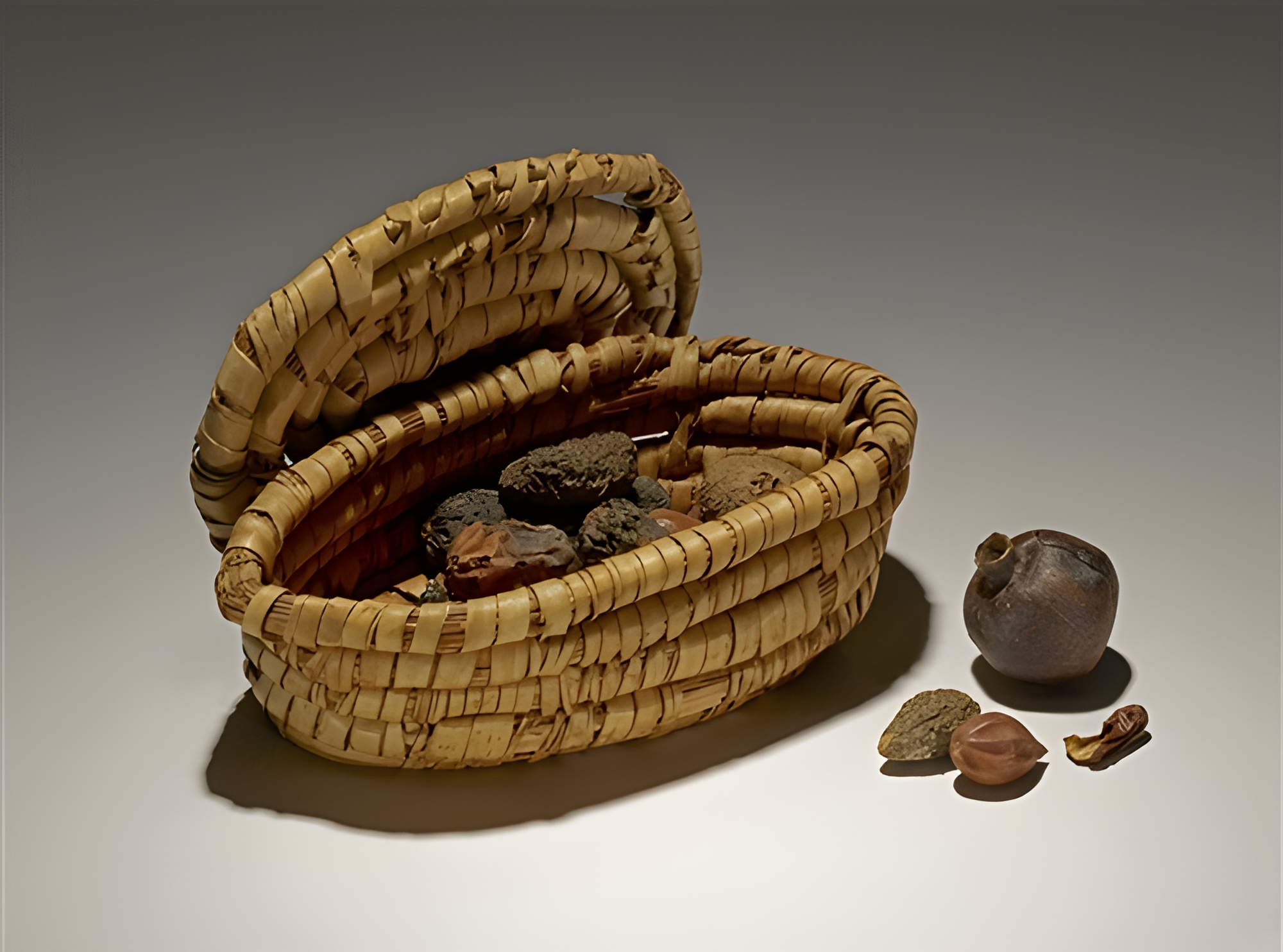바구니는 일반적으로 보석류 또는 이 예와 같이 음식 제물과 함께 무덤에 놓였다.