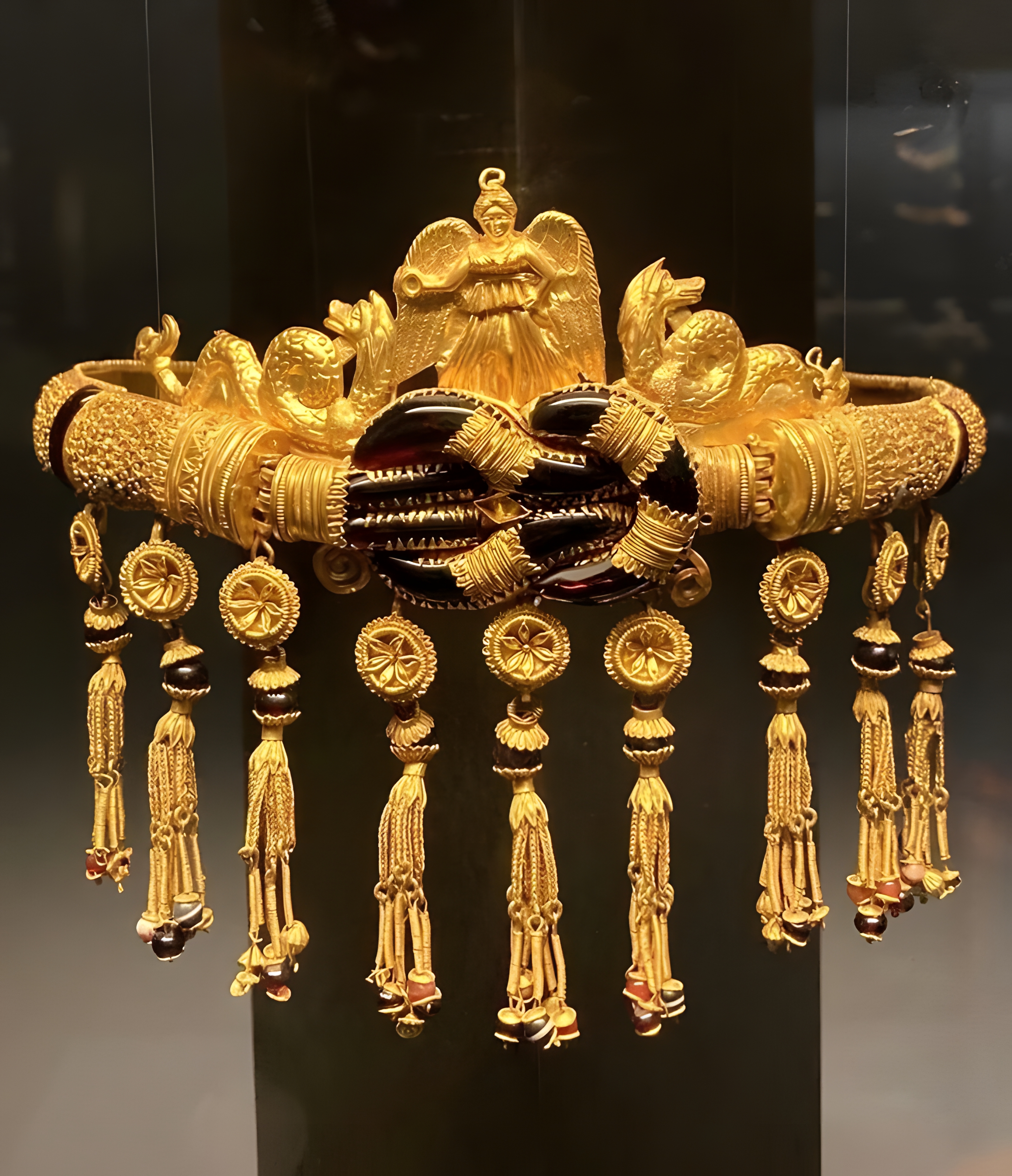 A Hellenic Gold Diadem (3 Century BC), which depicts the goddess of victory Nike and is adorned with garnet and cornelian stones.