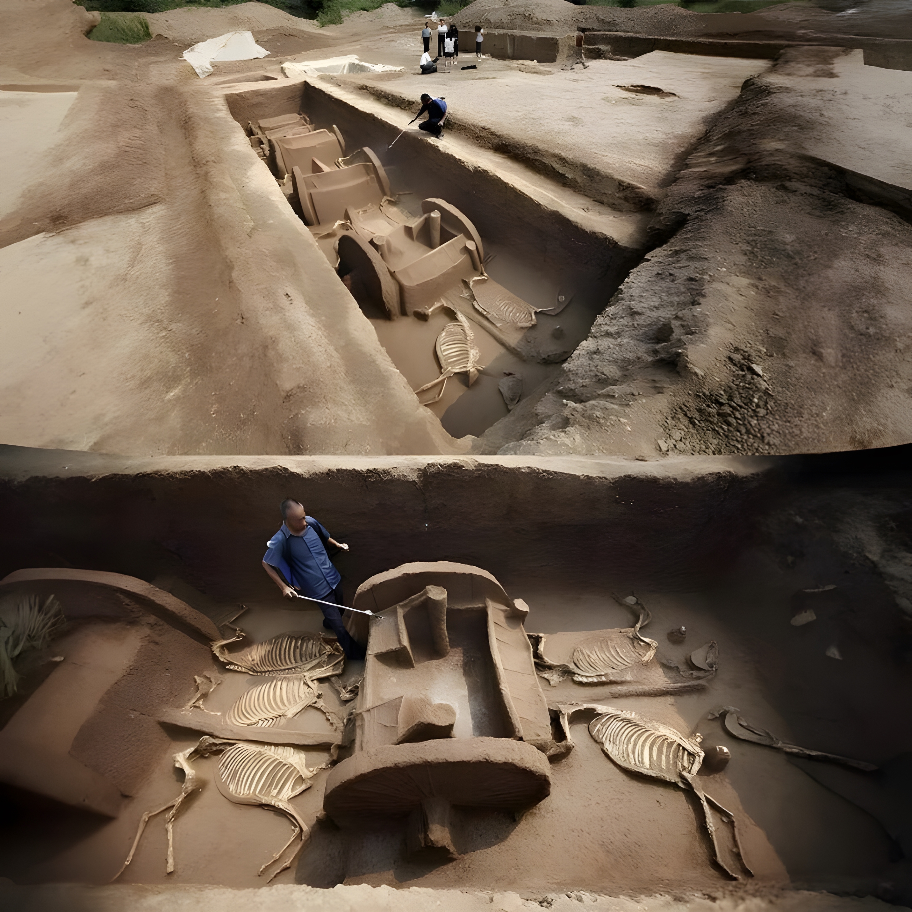 2011년, 중국 고고학도들이 저명한 고도古都 낙량에서 2천500년 전 동주東周시대 무덤 하나를 발굴하고 그에서 첨부사진과 같은 마차갱과 함께 묻은 말뼈를 확인했다.
