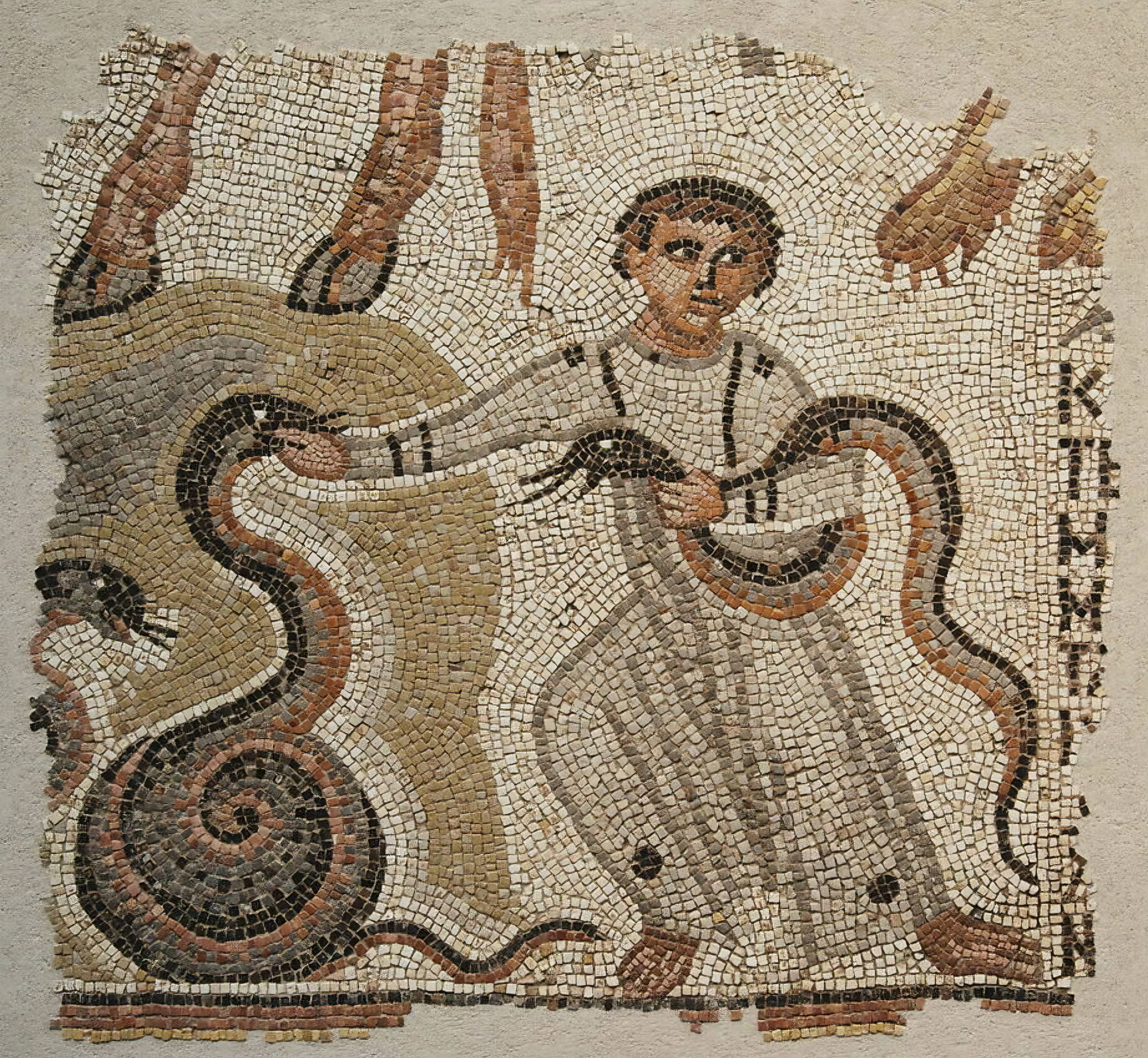뱀과 놀고 있는 어린 소년이 있는 다색 테셀라툼 모자이크Polychrome tessellatum mosaic