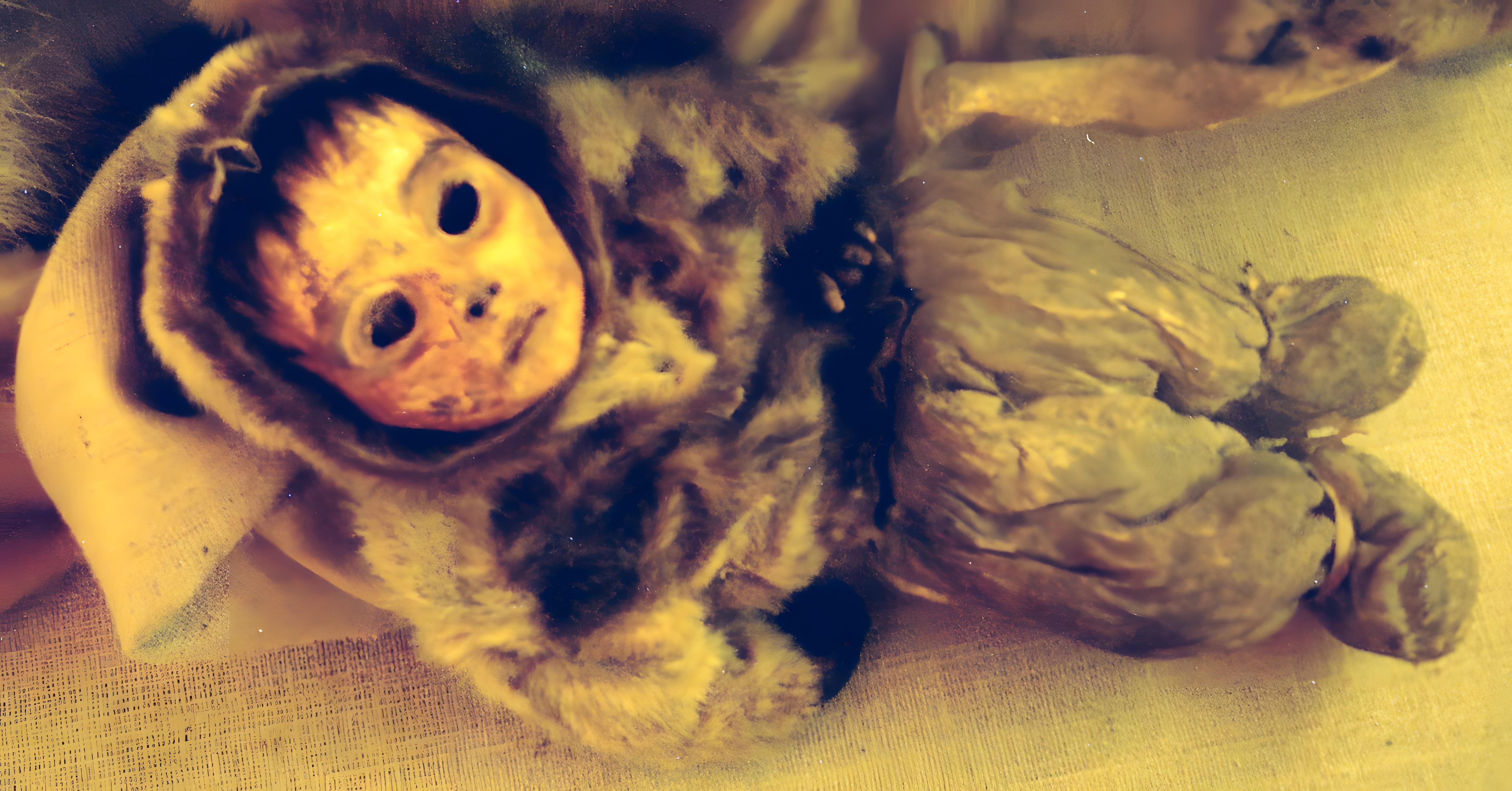 This mummy is very poorly preserved. She could be the sister of II/6. The woman suffered from a malignant, end-stage tumor, which probably impaired her senses of hearing and sight, as well as a poorly healed broken shoulder. Her poor health could be a possible cause of death. As with all of the older women found, she was missing several teeth. Furthermore, all the older mummies showed clear signs of dental erosion, which might be explained by their tough diets as well as by stress caused by tanning and removing fur from leather (here, animal hides were removed by scraping with the teeth). Bad teeth were especially dangerous for Inuit peoples with regard to their diets, which were largely raw, meat-based, and difficult to chew.