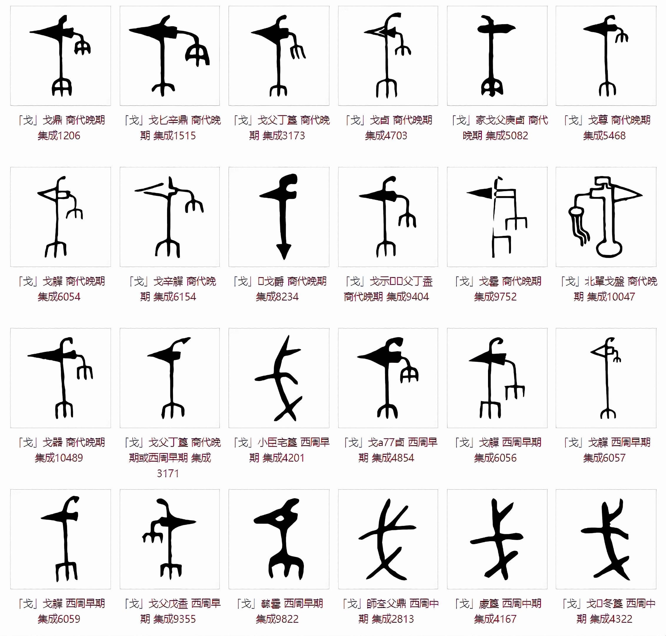 은상殷商시대 갑골이나 청동기에 보이는 저 글자들을 보면 戈는 실제 모습을 본떠 만든 상형임을 단박에 안다. 자루에 찡가서 상대를 베거나 찌르는 데 사용했다.