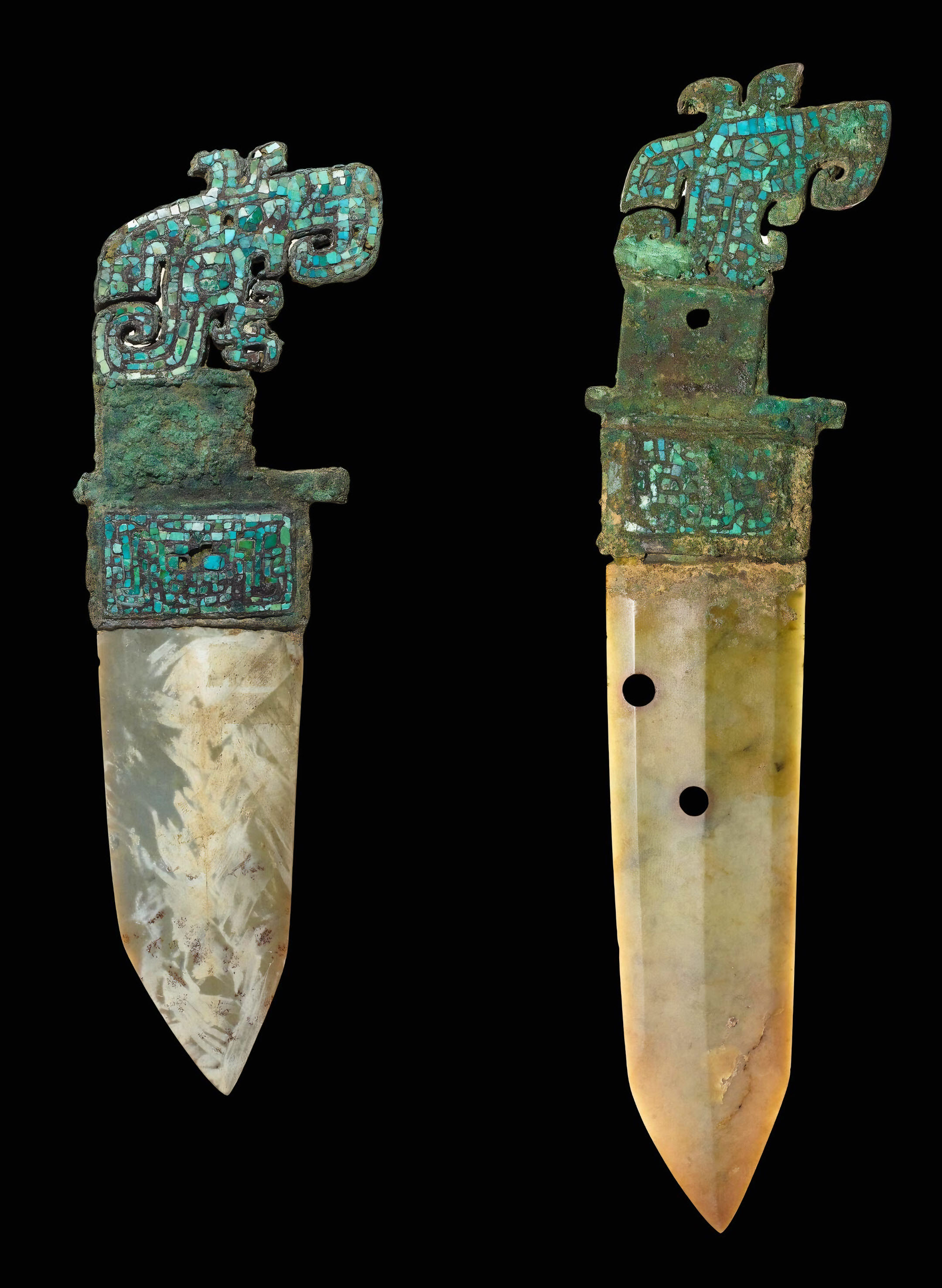 보다시피 자루 쪽은 청동으로 만들되 터키석을 비롯한 준보석을 화려하게 장식하고 칼 몸통은 옥으로 제작했다.