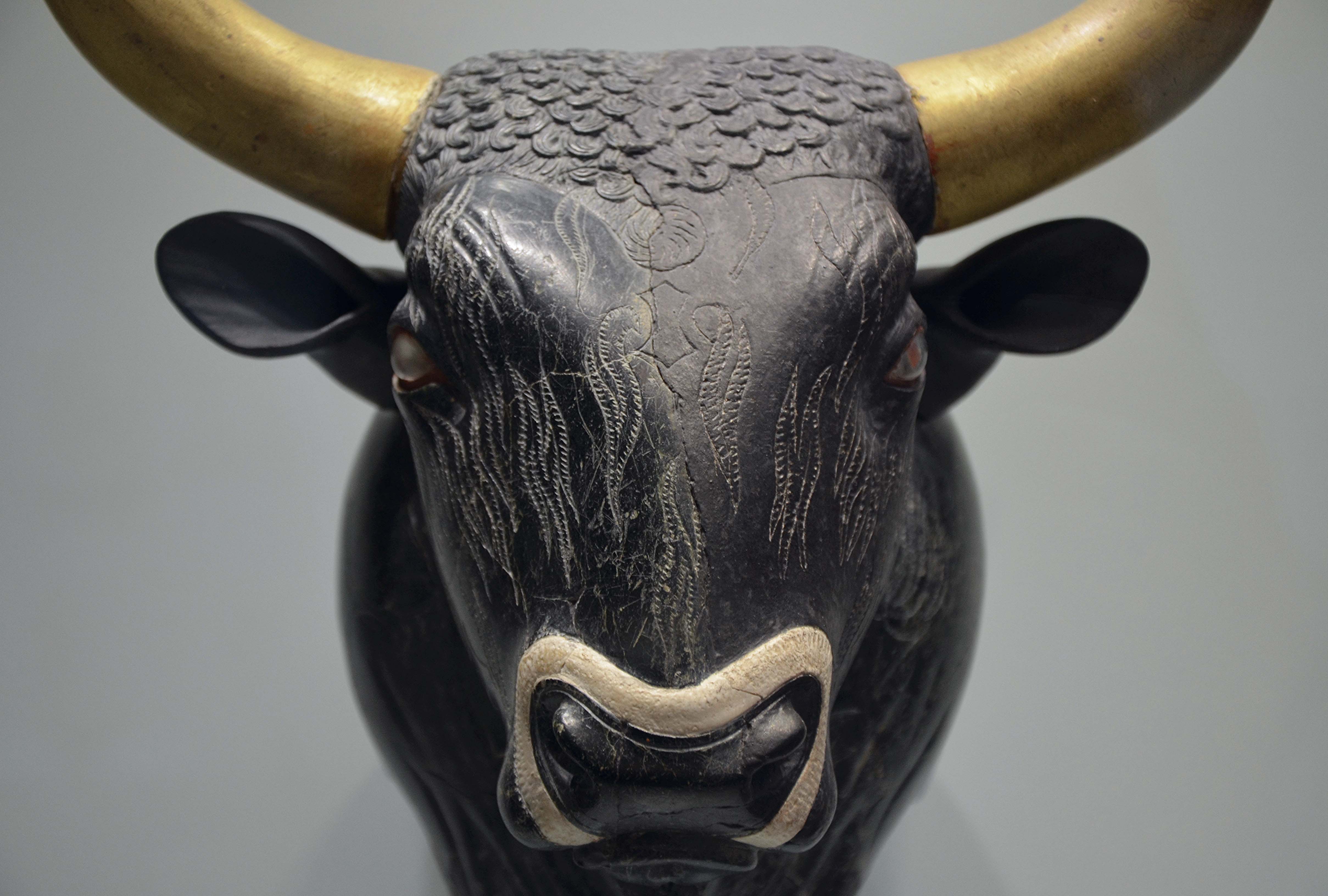 눈 가장자리는 빨간색 재스퍼로 상감해 황소가 거칠고 무섭고 충혈된 모습을 보여준다.