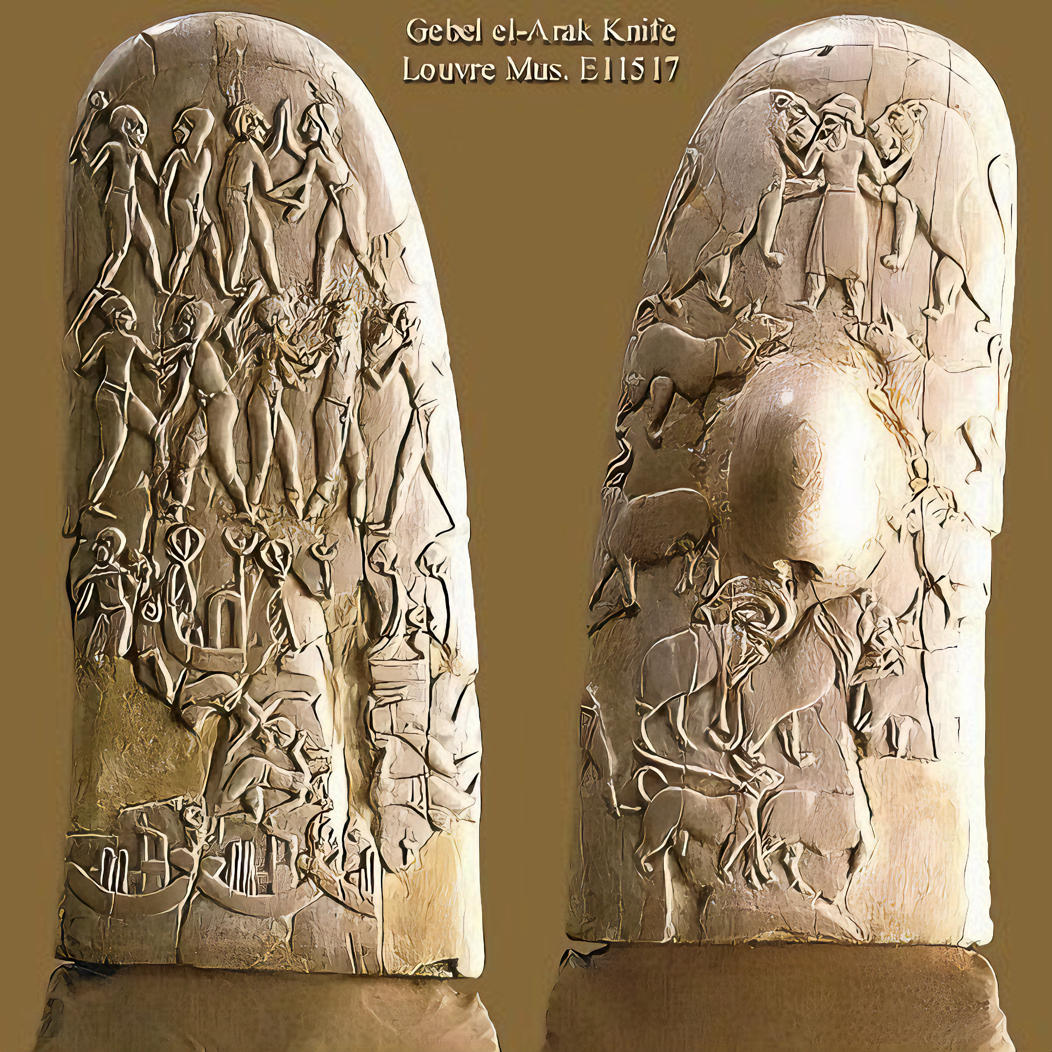 저 칼은 이집트 선사시대 나카다Naqada 2기(기원전 3500~3200년)에 속하며 자루는 상아, 칼날은 돌이라, 메소포타미아 영향을 보여준다 한다.