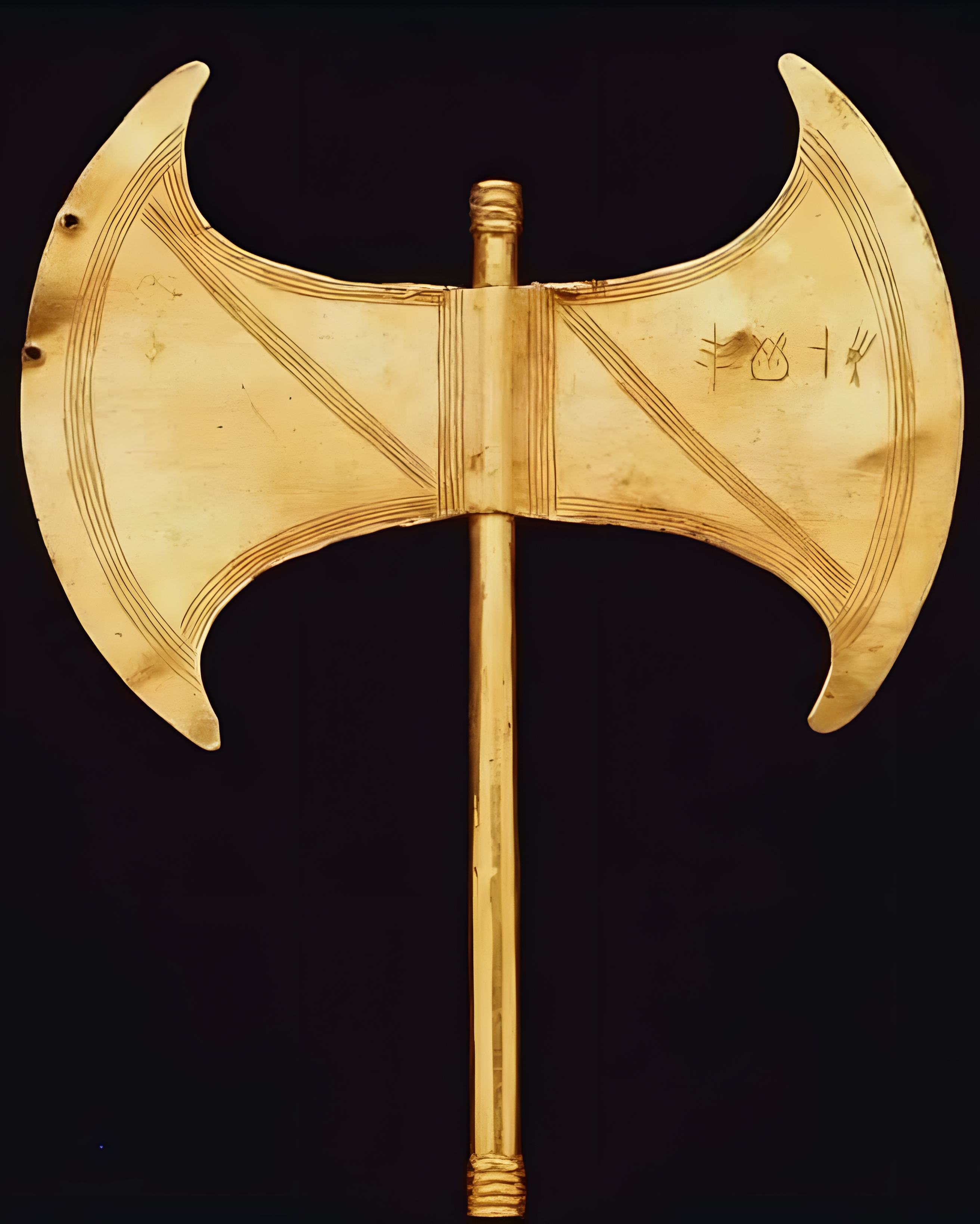 Gold double axe composed of thin sheet gold mounted on a hollow gold shaft and outlined by bands of five incised lines. On left blade, inscription of four signs in undeciphered Linear A; posssible an invocation to the goddess Demeter. Two pierced holes on right blade. The axe was deposited in a sacred cave as a votive offering.