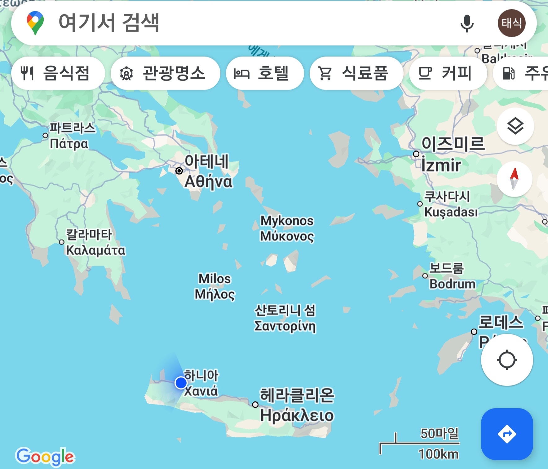 이 섬은 그 정중앙 북쪽 해변 이라클리오Heraklion라는 데가 중심을 이루어니니와 이를 중심으로 동서쪽으로 가를 수 있지 않을까 한다.