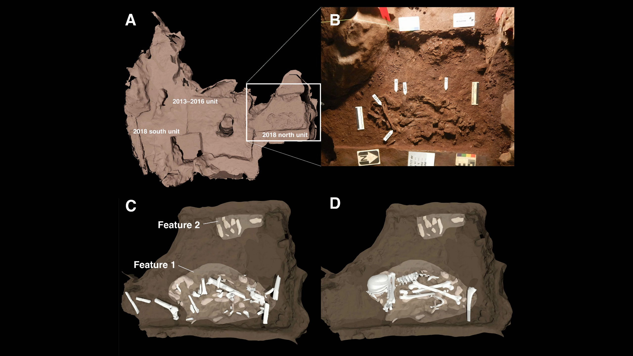 이 연구들은 한 동굴 방 바닥에 있는 두 개 얕은 타원형 구덩이를 묘사했는데, 이 구덩이에는 퇴적물에 묻힌 후 부패한 살덩이 시신의 매장과 일치하는 유골이 있었다.