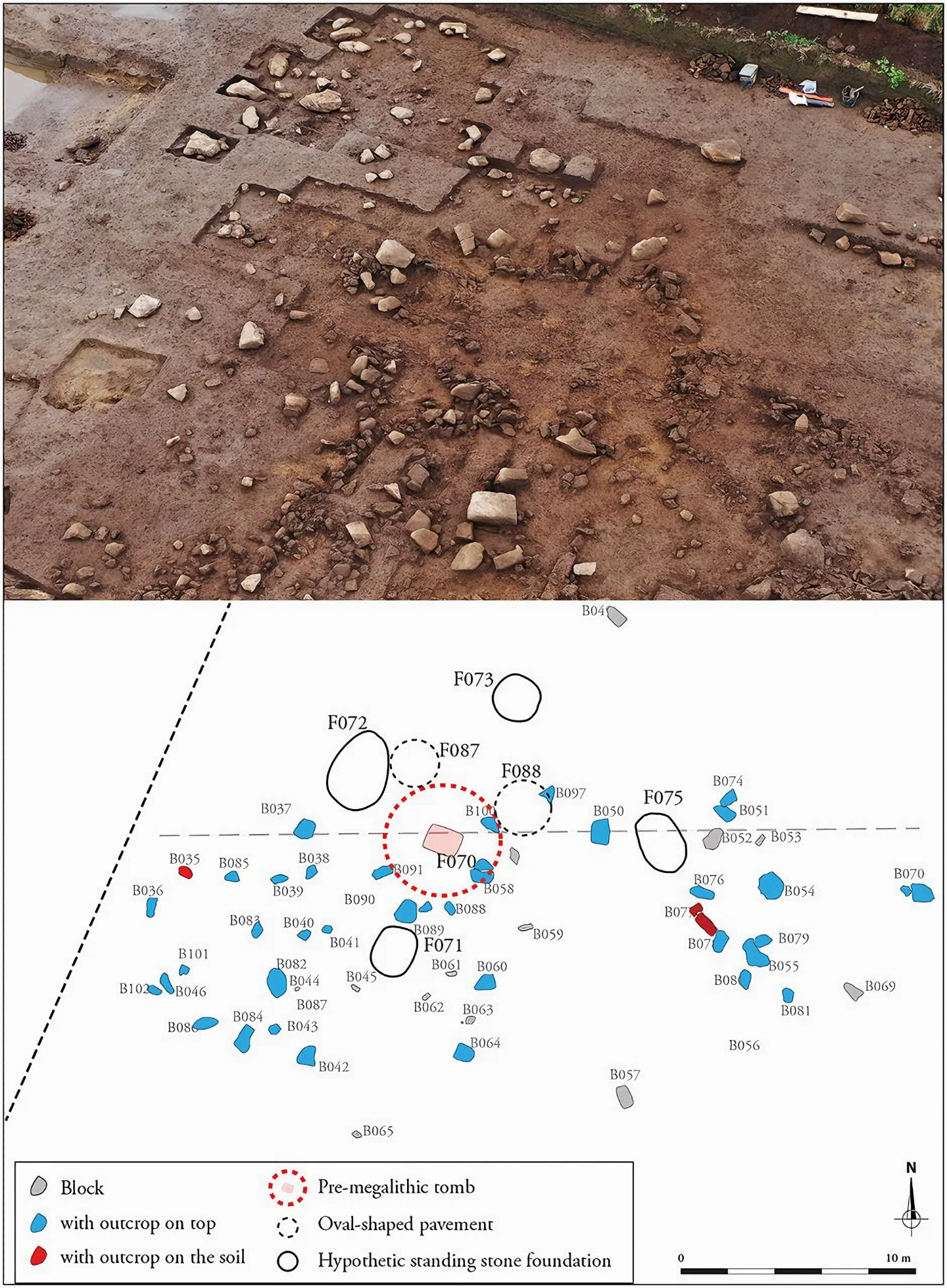 위) 장례 건축물 주변 모노리스monoliths를 공중에서 본 모습; 아래) 기념물 주변 블록과 구조물 분포를 보여주는 평면도(A. Blanchard & J.N. Guyodo 제작). 출처: Blanchard et al., Antiquity (2025)