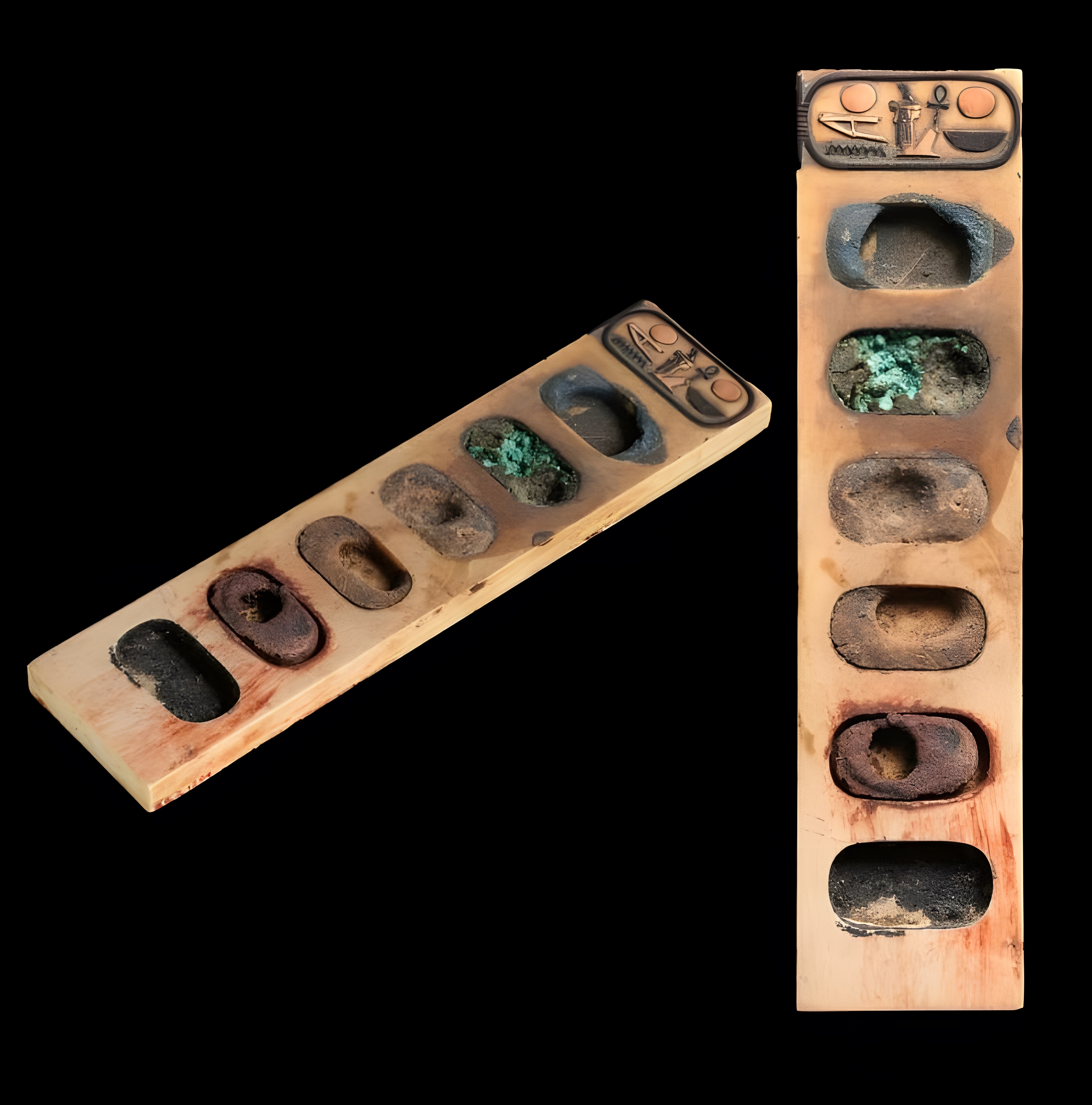 This painter’s palette was carved from a single piece of ivory. Six oval wells contain cakes of pigments including blue, green, brown (?), yellow, red, and black. The oval cartouche at one end encircles the throne name of Amenhotep III, Neb-Ma’at-Re, a