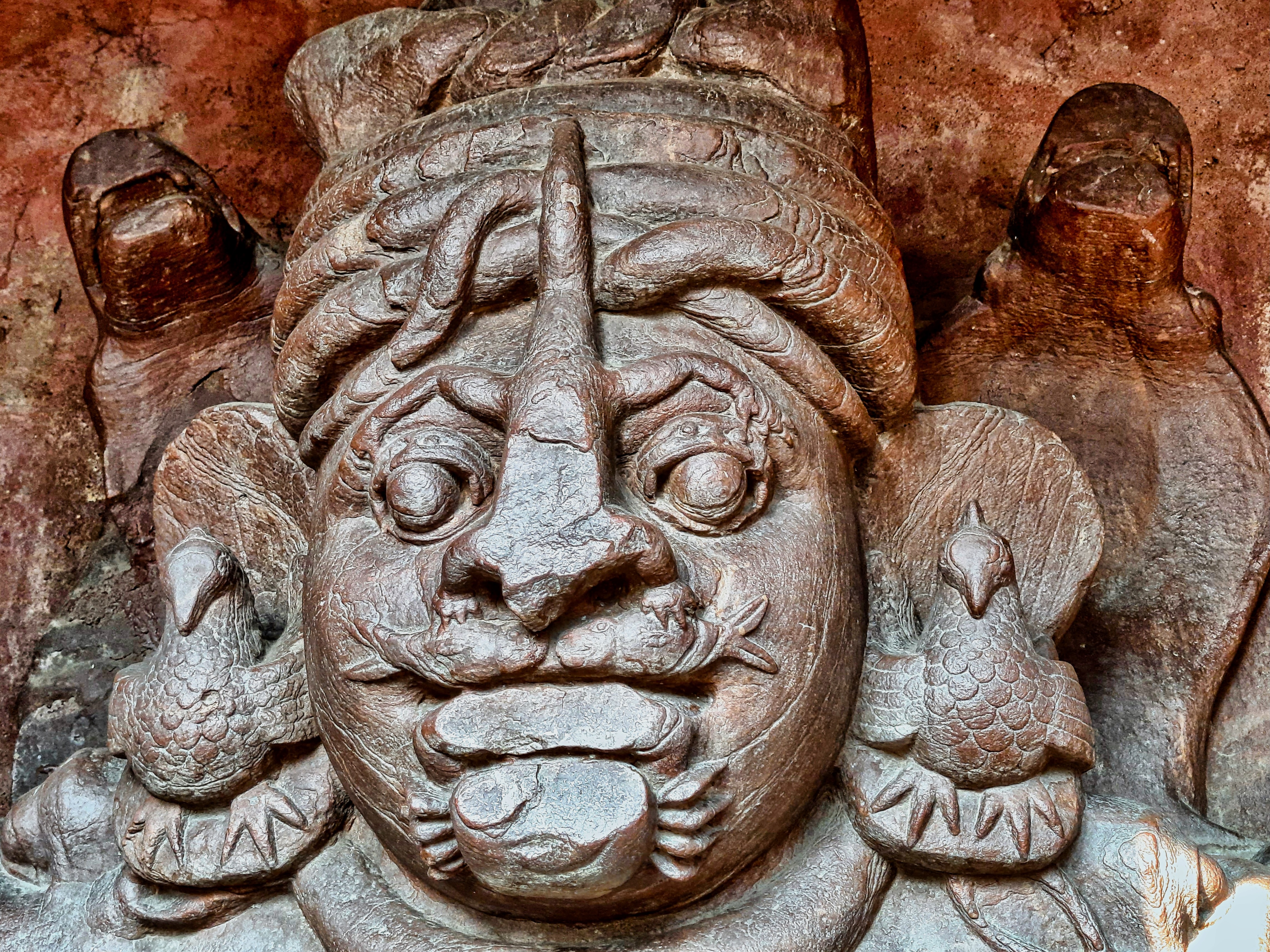뱀은 머리카락과 터번을 형성하고, 도마뱀은 코, 도마뱀 뒷다리는 눈썹, 개구리는 눈, 물고기 두 마리는 콧수염, 게는 턱과 입술, 공작 두 마리는 귀, 악어 두마리는 어깨를 형성한다.