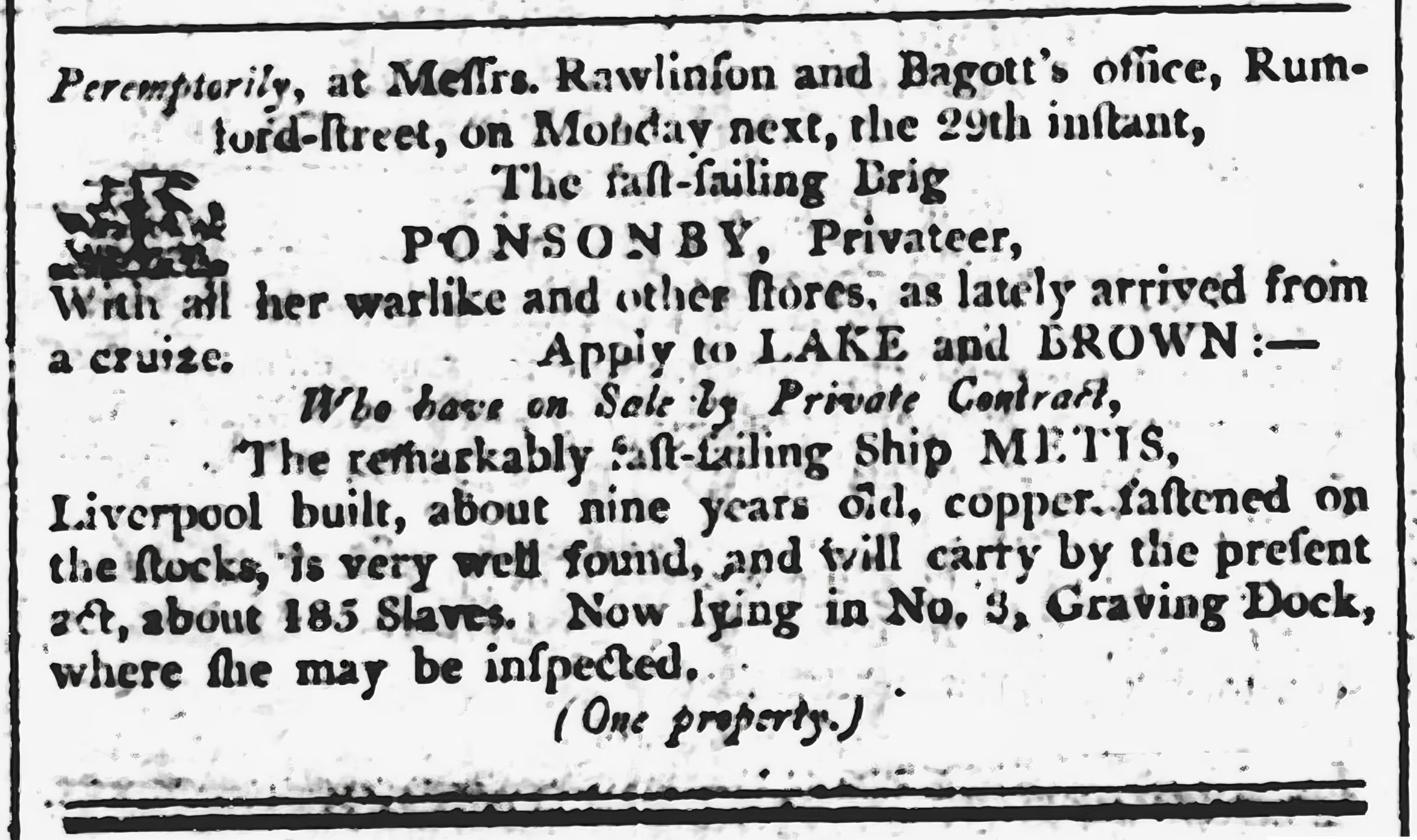 "레이크 앤 브라운Lake and Brown에 문의하세요. 리버풀에서 건조된 약 9년 된 놀랍도록 빠른 범선 메티스호를 수의 계약으로 판매합니다. copper fastened on the stocks하며[무슨 뜻인가? on the stocks를 브리티시 잉글리시에서는 in preparation or under construction을 의미한다는데?], 매우 잘 건조되었으며, 본 법률에 따라 약 185명의 노예를 실을 수 있습니다. 현재 3번지, 해체 선착장에 정박해 있으며, 그곳에서 검사를 받을 수 있습니다.
