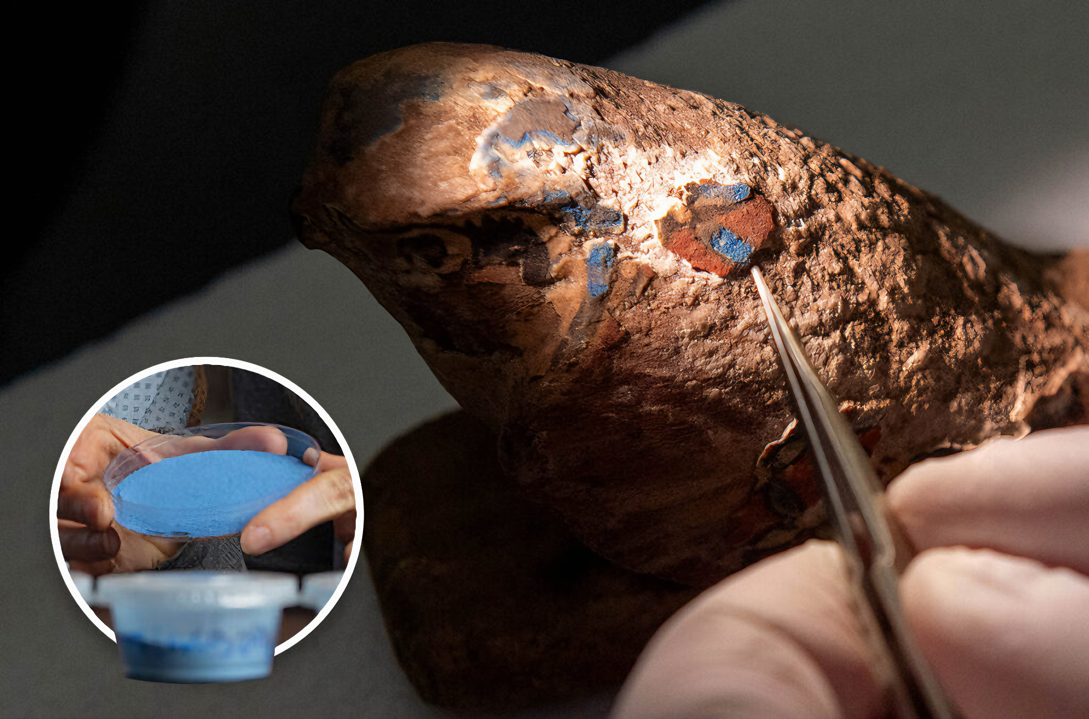 고대 이집트 목제 매를 살펴보는 손과 족집게 클로즈업 사진과 워싱턴 주립대학교(WSU)에서 개발한 파란색 분말이 담긴 삽입 사진.