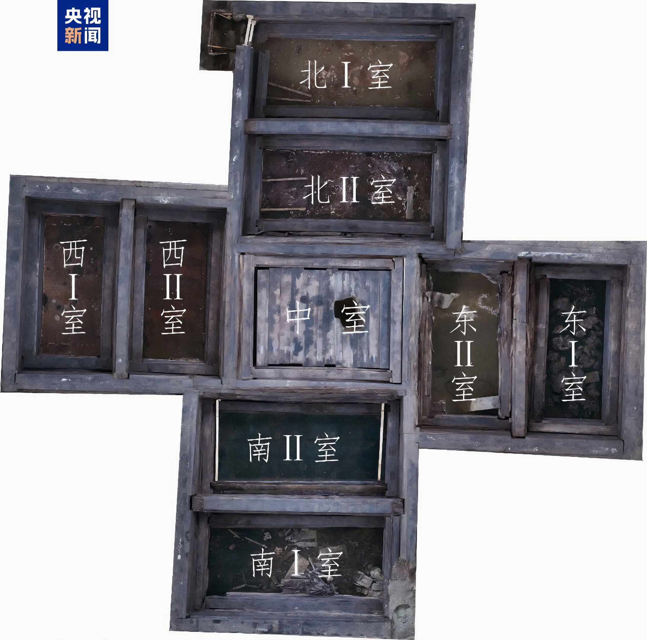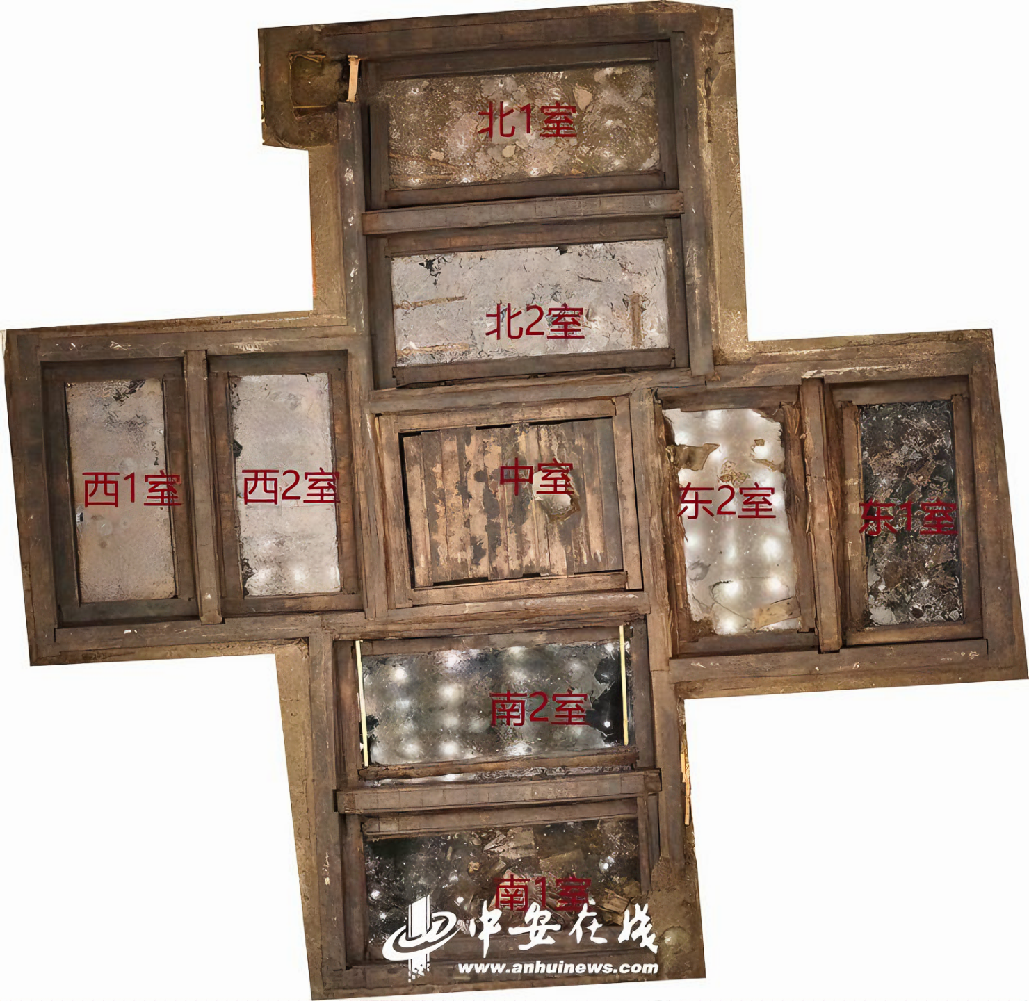 무덤 구덩이 중앙에는 '아자형亞字形' 곽실椁室이 있으며, 주변에는 8개 측실侧室이 배치되어 있다.