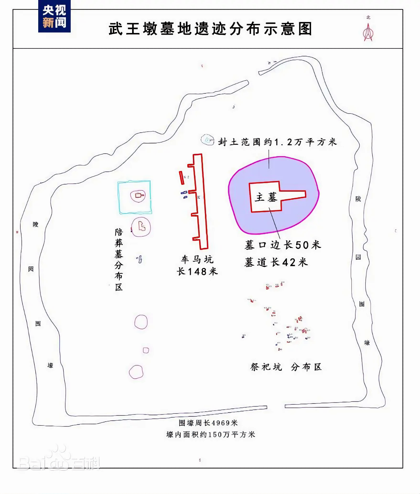 무왕둔 무덤에는 현재 주묘主墓(1호 무덤一号墓), 묘원墓园, 마차 구덩이车马坑, 배장묘陪葬墓, 제사 구덩이祭祀坑 등 중요한 유적이 보존되어 있으며, 전체 묘원 면적은 2100여 묘亩에 달한다.