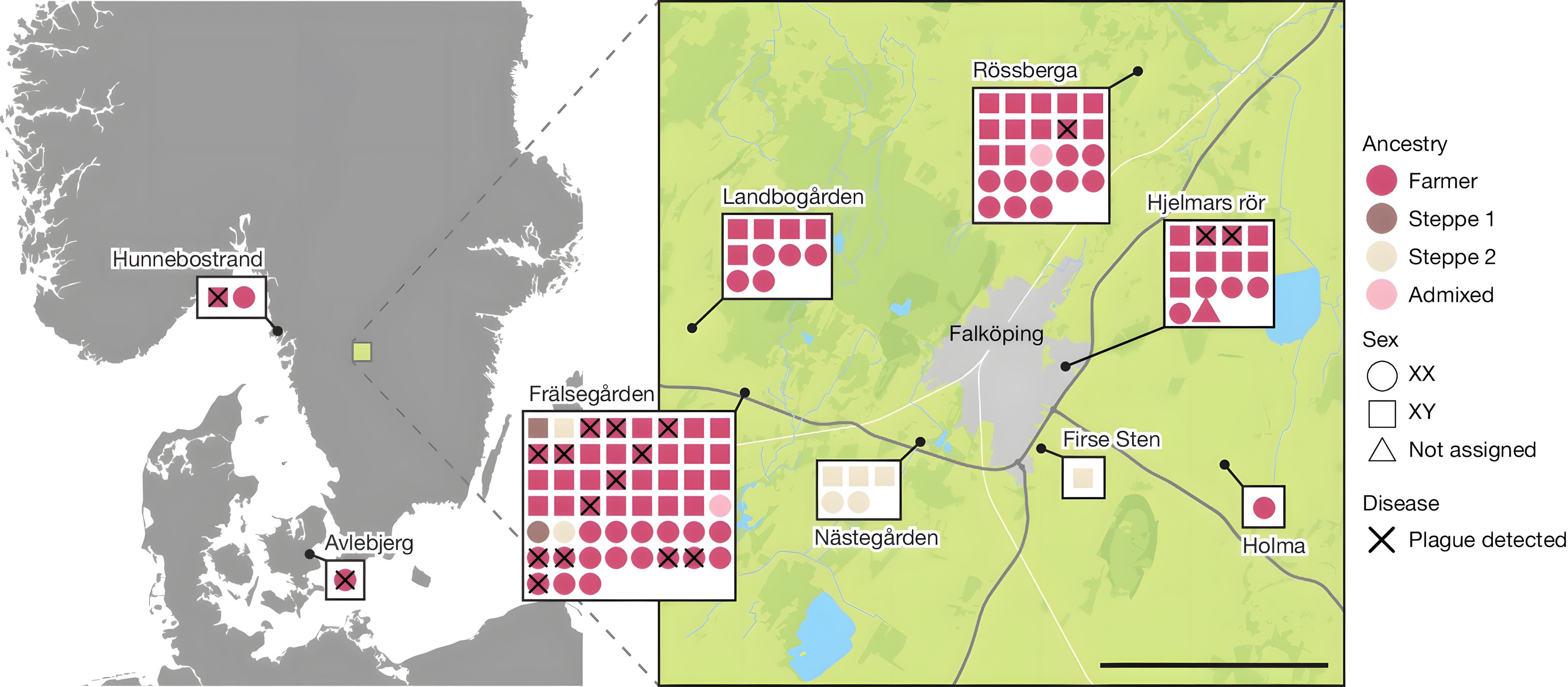 여기에서 우리는 인구 규모의 고대 유전체학을 사용하여 8개 거석 무덤과 1개 석조 무덤에서 스칸디나비아 신석기 시대 개인의 조상, 사회 구조 및 병원체 감염을 추론한다. 우리는 신석기 시대 전염병이 광범위하게 퍼져 있었고, 표본 인구의 최소 17%에서 넓은 지리적 거리에 걸쳐 발견되었음을 발견했다.