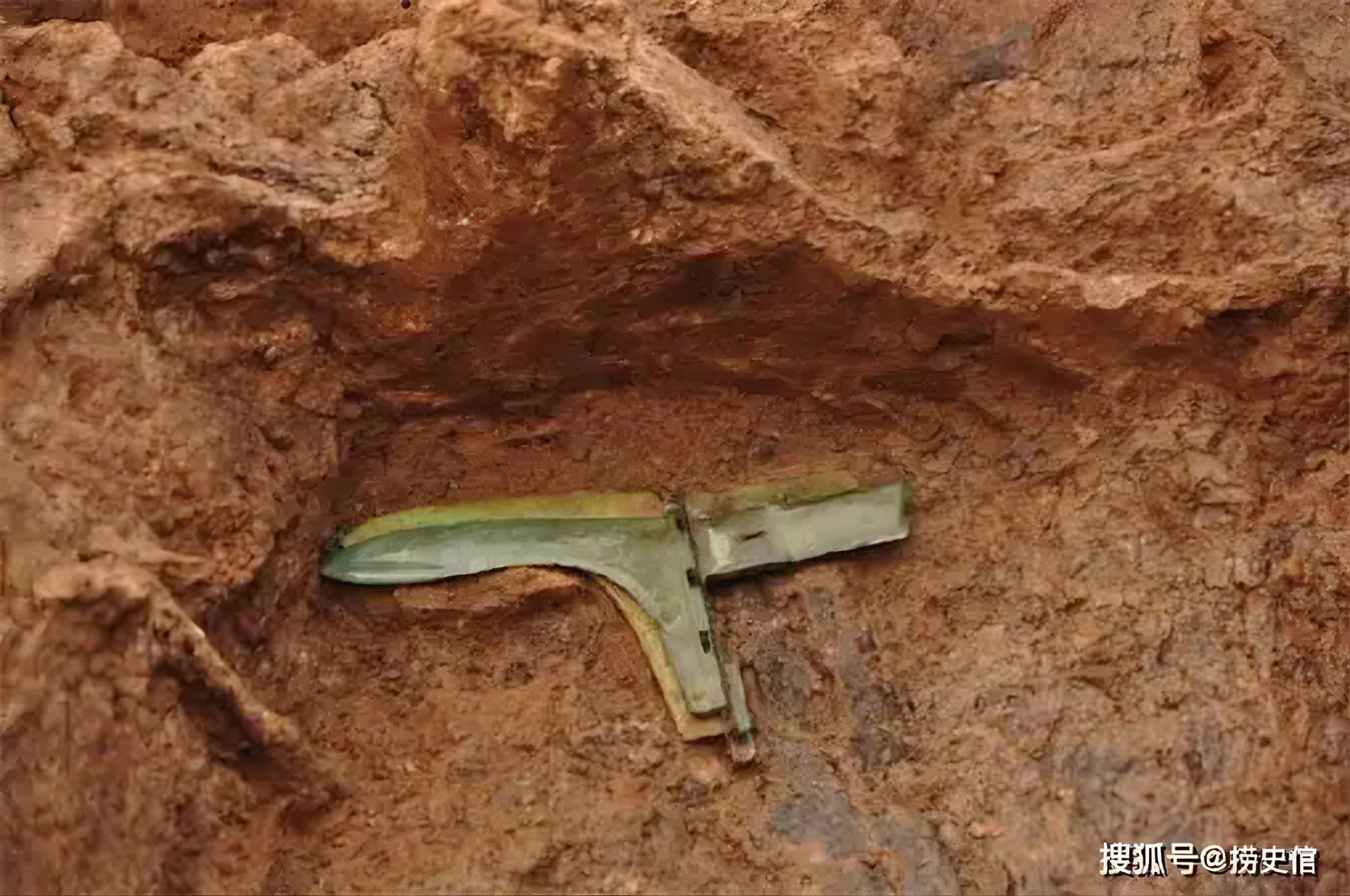 옆방侧室에서 수습한 고풍스러운 모양 비교적 큰 철기는 모양이 마치 괭이锄头와 같고, 손잡이는 나무다.