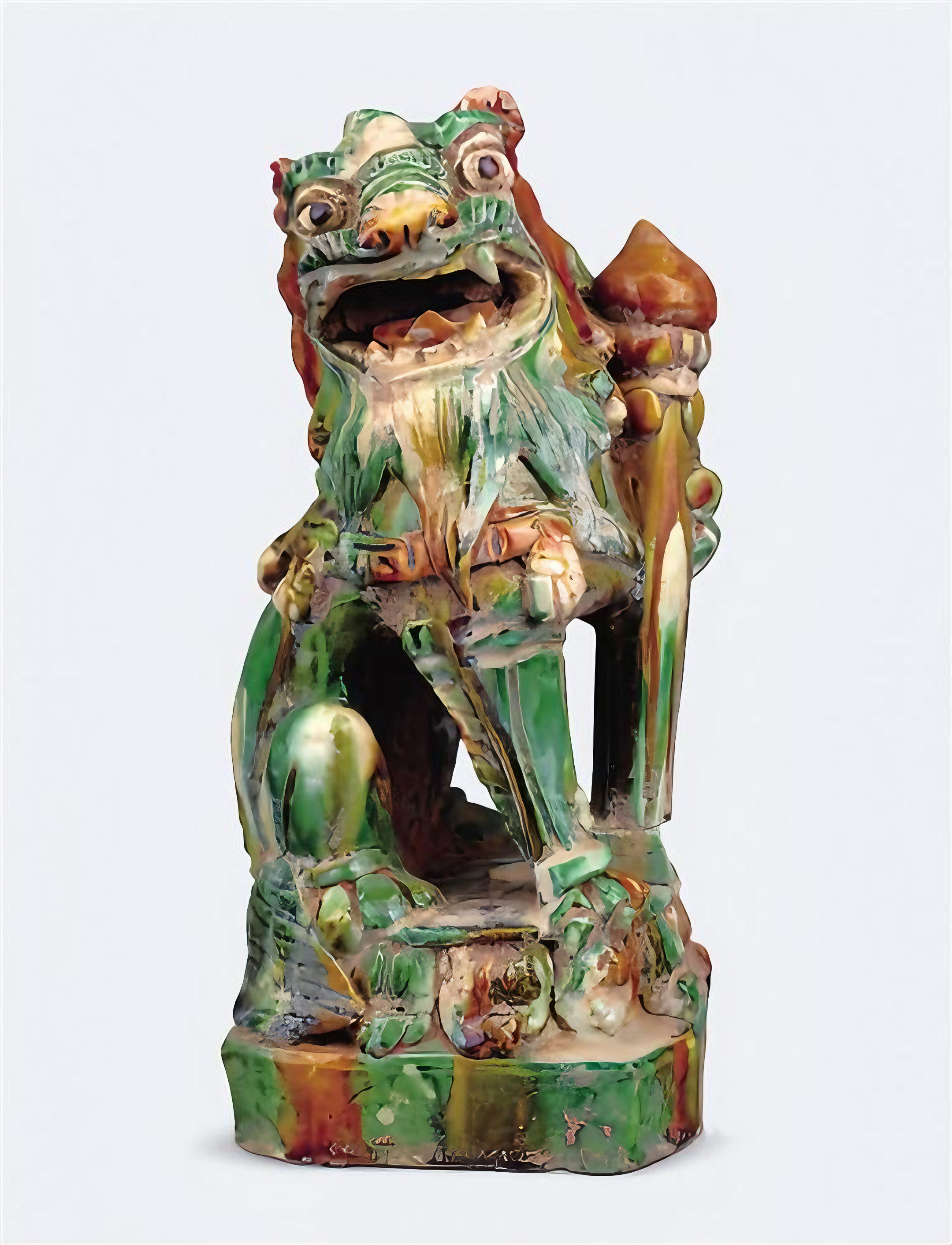 주목할 점은 정교하게 제작된 독특한 모양의 삼채 포당 사자가 전체적으로 녹색, 노란색, 갈색 유약을 발랐으며, 유약 색상이 복잡하다는 것이다.