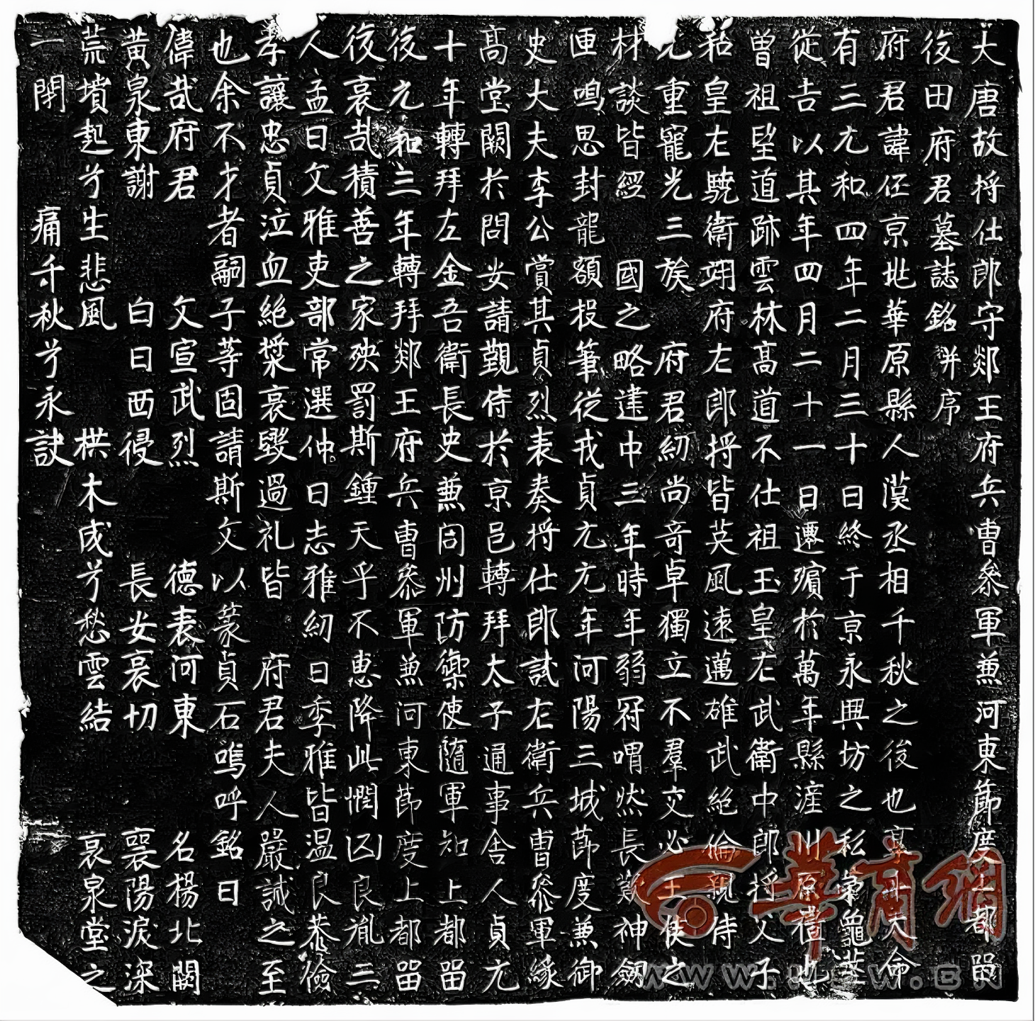 田伾墓志,盖为方形,盝顶,顶面阴刻楷书“大唐故田府君墓志铭”,共3行9字,四周线刻卷草纹。志石为方形,四周略有残缺。志石边长47、厚12厘米。志文楷书,22行,满行22字,共计351字。
