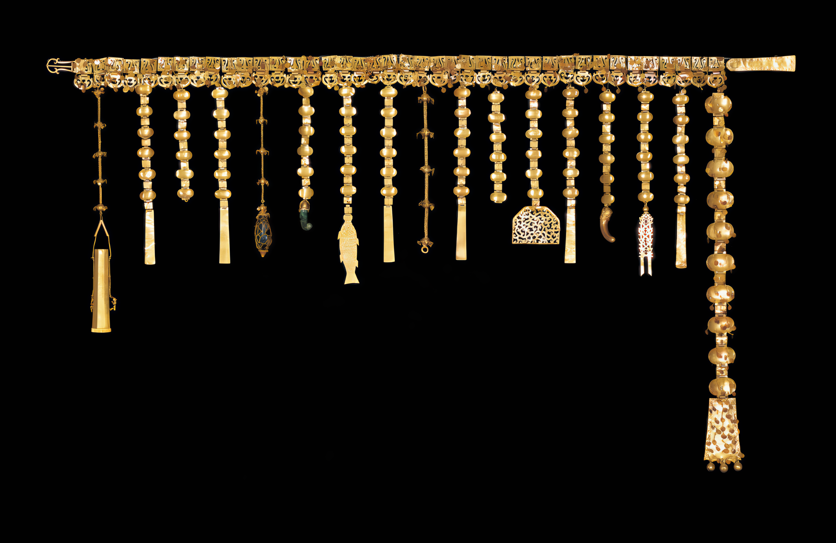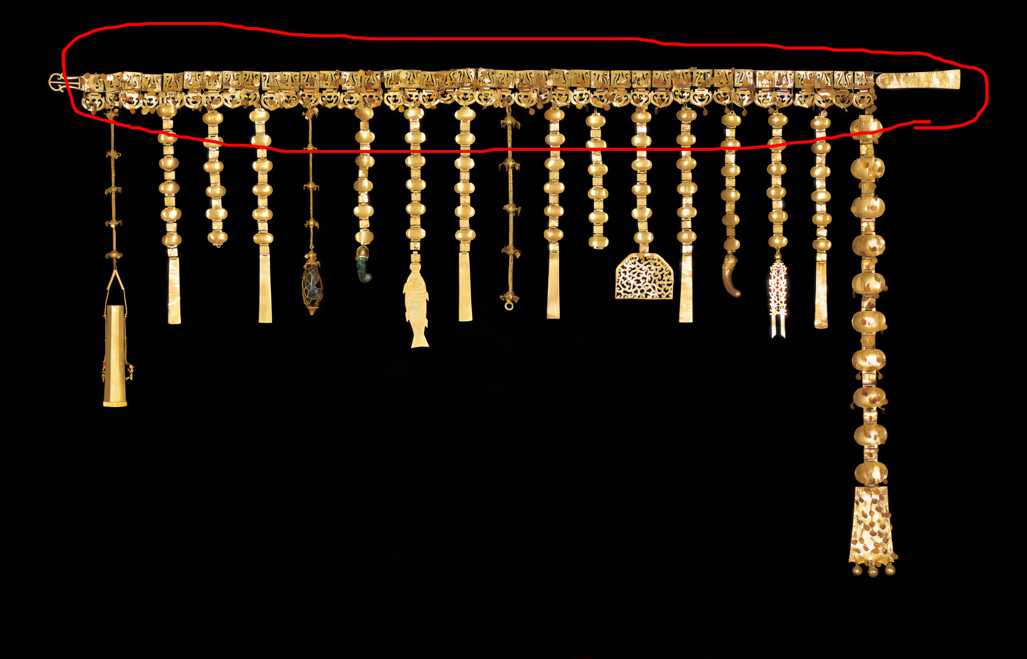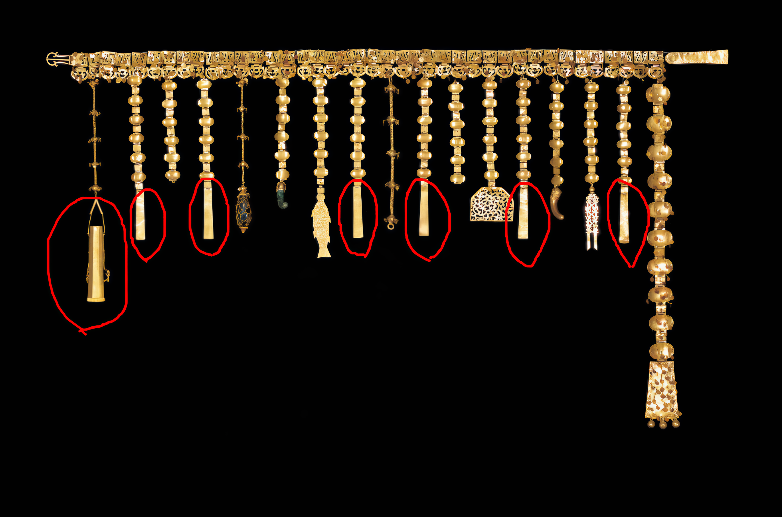 띠드리개 끝에는 장규형 금판長圭形金板, 각형통, 물고기 모양, 곡옥, 방육각형方六角形, 투작금판透作金板 등이 달려 있다.