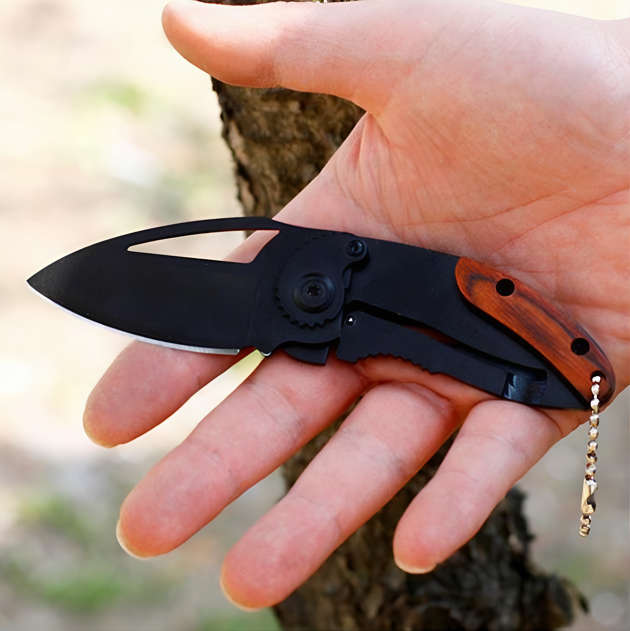 이 휴대용 칼은 이중 상실 방지 장치를 했다.