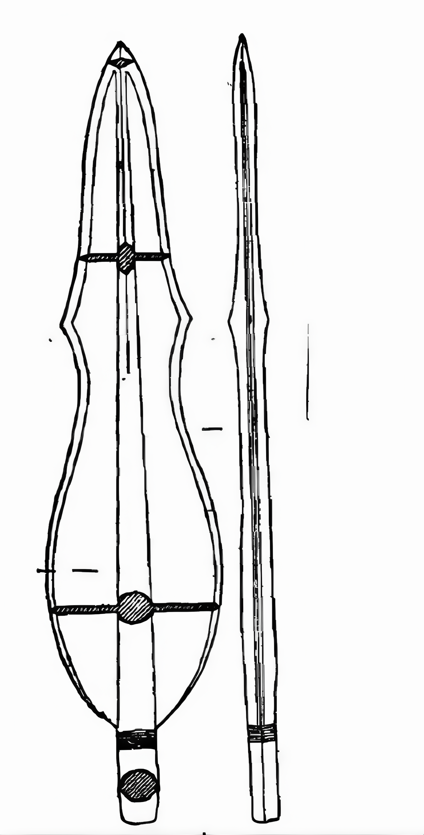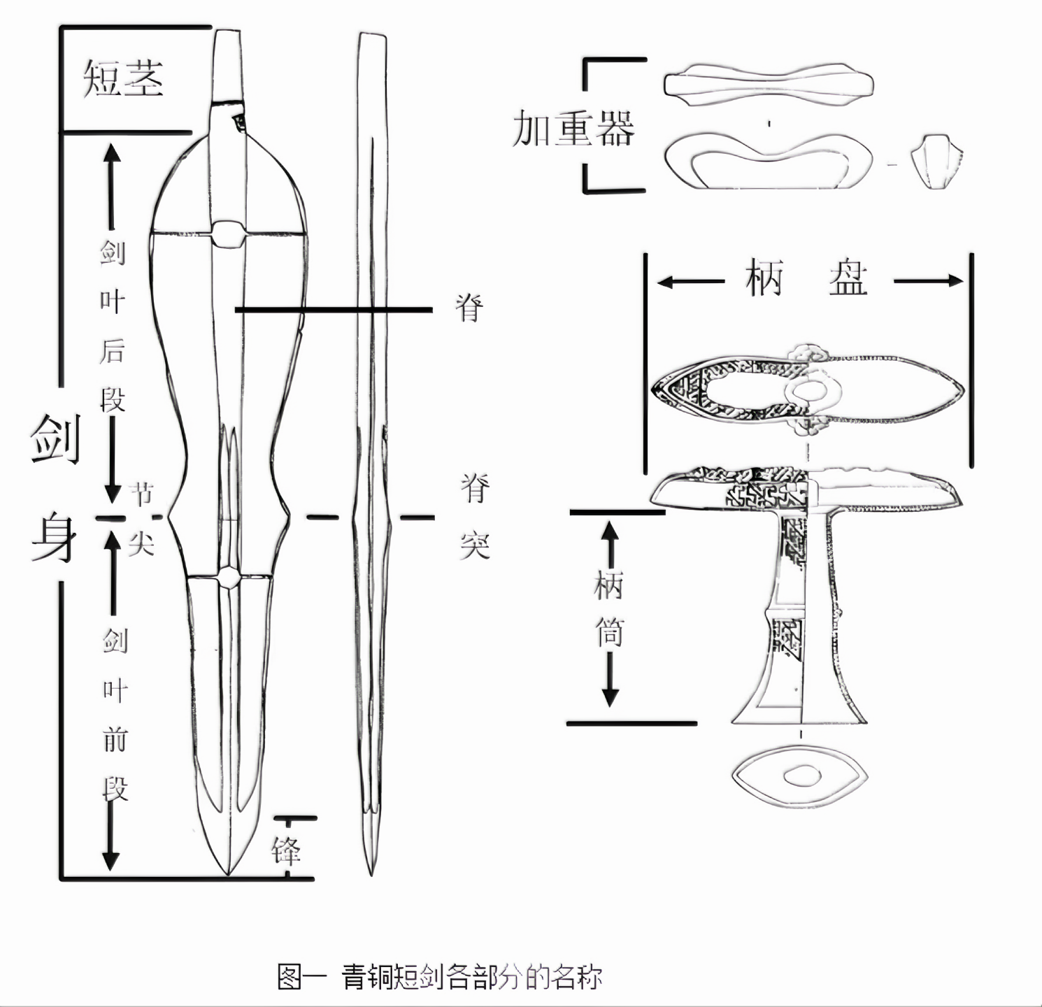 청동으로 주조되었으며, 형태는 가늘고 짧으며 양쪽에는 날카로운 날이 있다.
