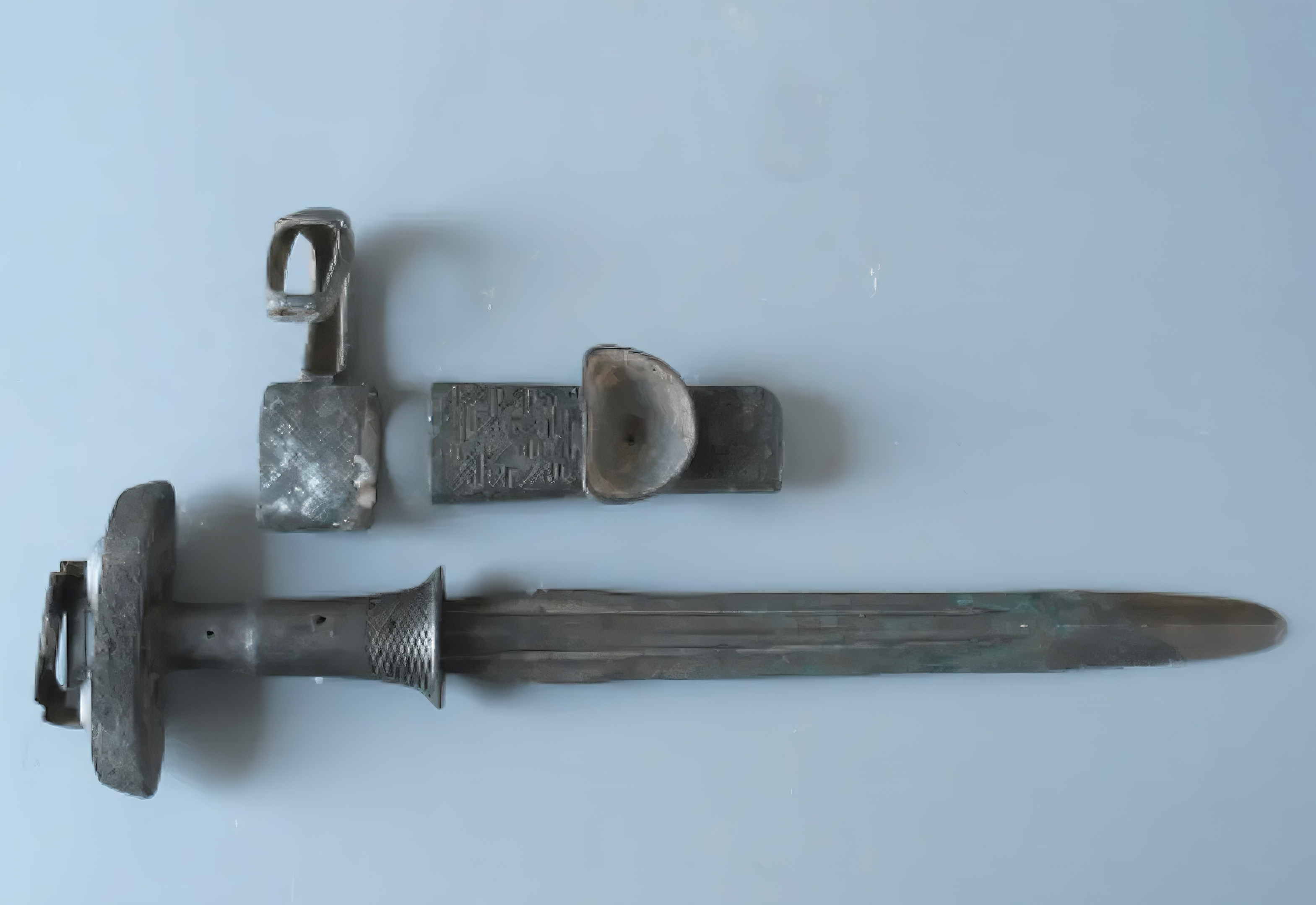 칼자루는 'T'자 모양으로, 세밀한 삼각형과 사선 무늬로 장식했고 철광석을 갈아 만든 가중기加重器를 장착한다.
