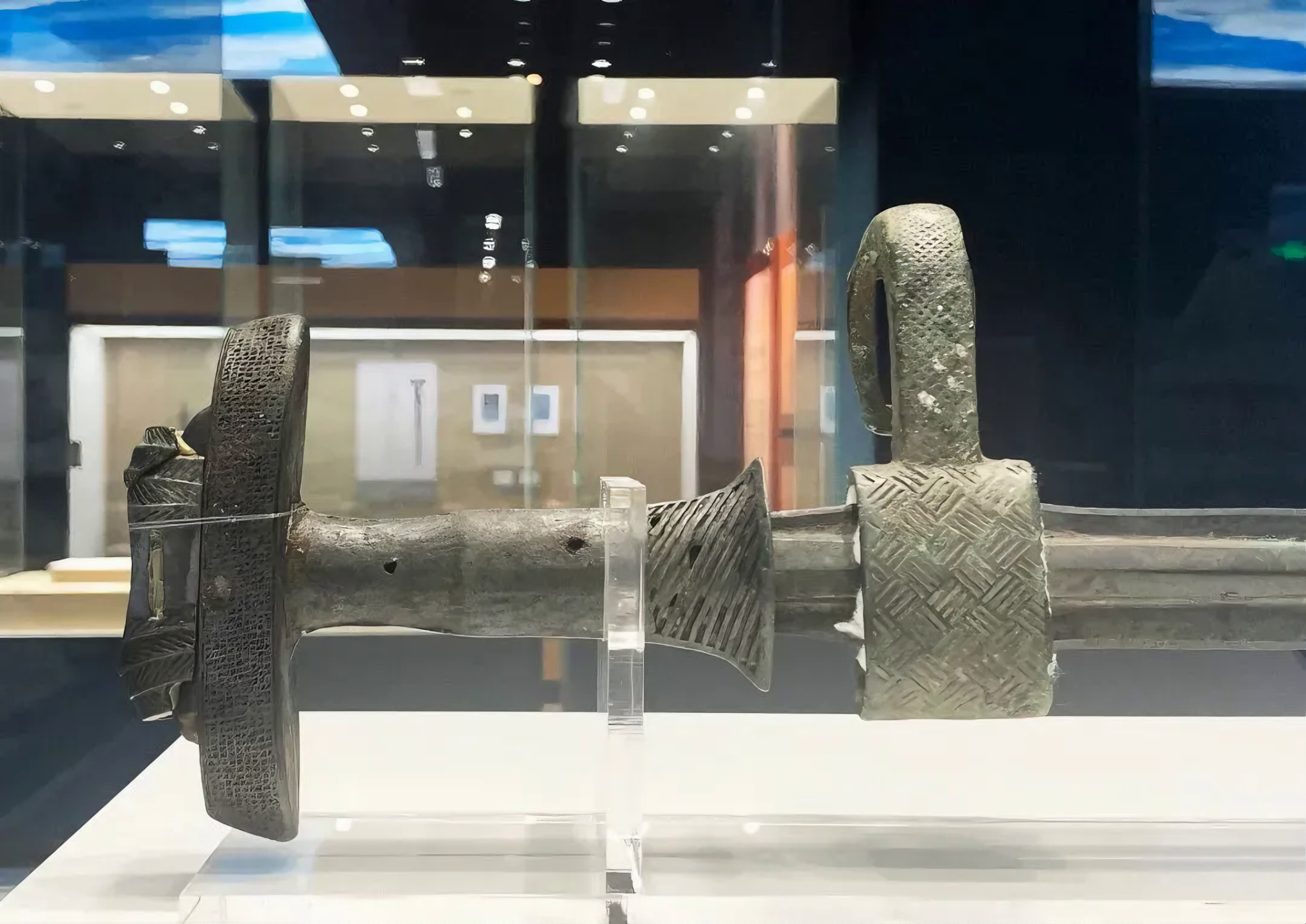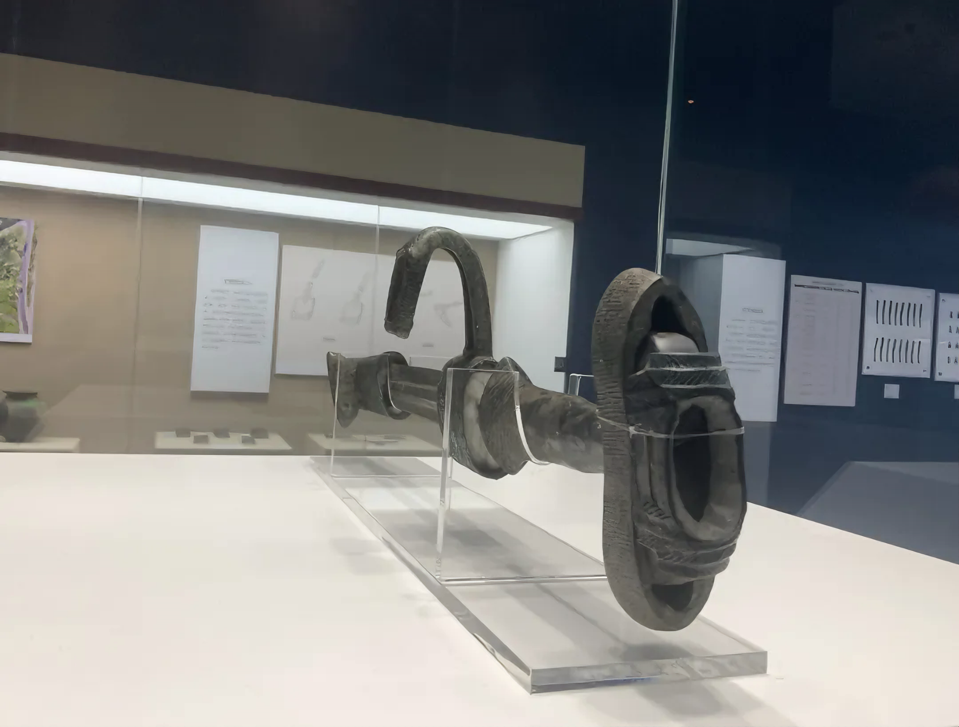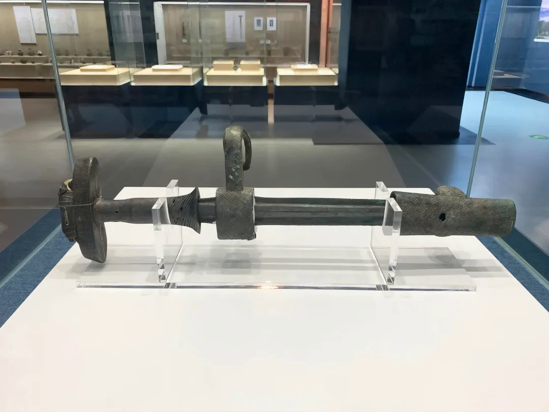 이 박물관 소장품 중에 전국 정자병 곡인 주척 청동 단검 战国丁字柄曲刃铸脊青铜短剑 이라 이름하는 청동칼이 있으니,