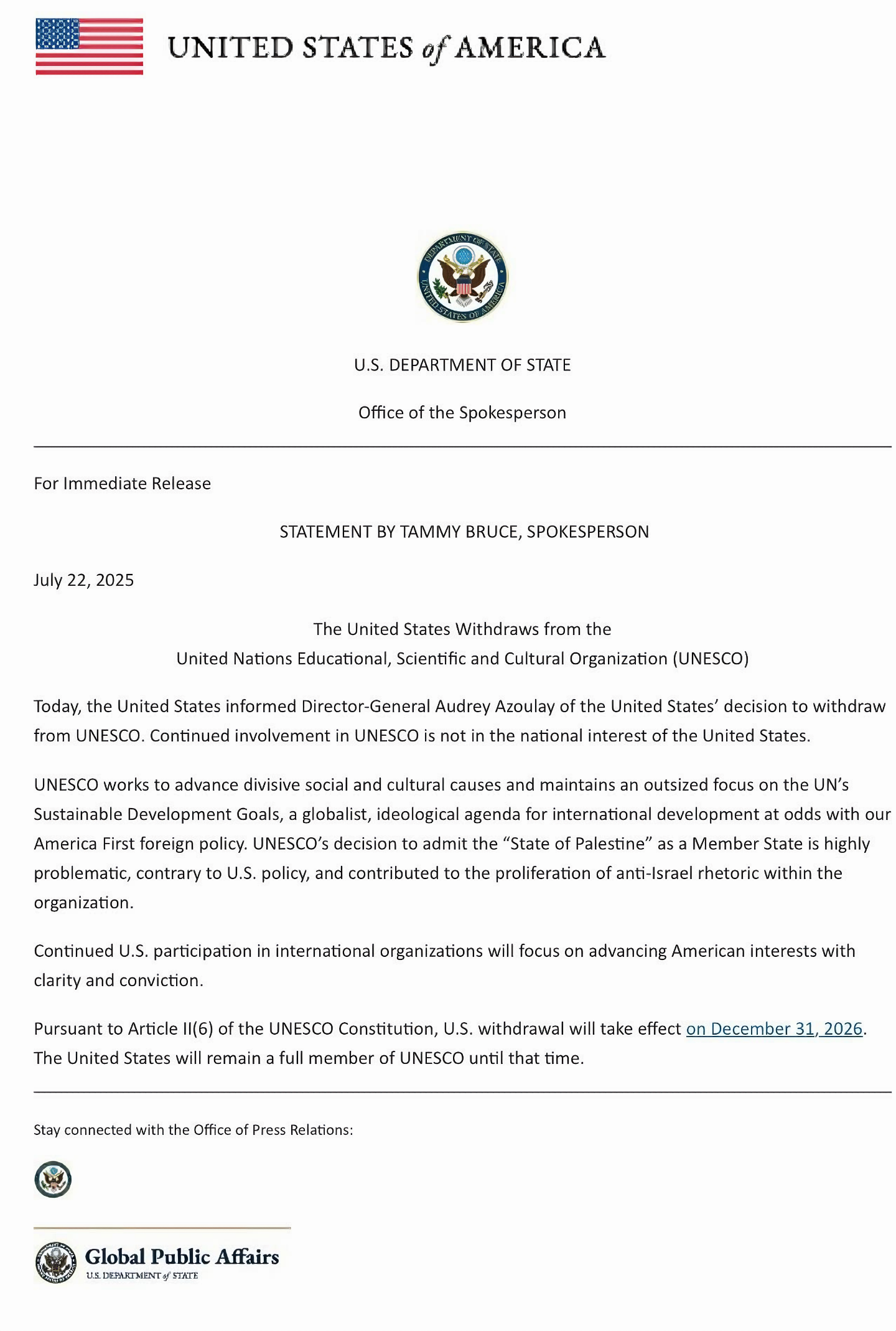 Pursuant to Article II(6) of the UNESCO Constitution, U.S. withdrawal will take effect on December 31, 2026. The United States will remain a full member of UNESCO until that time.
